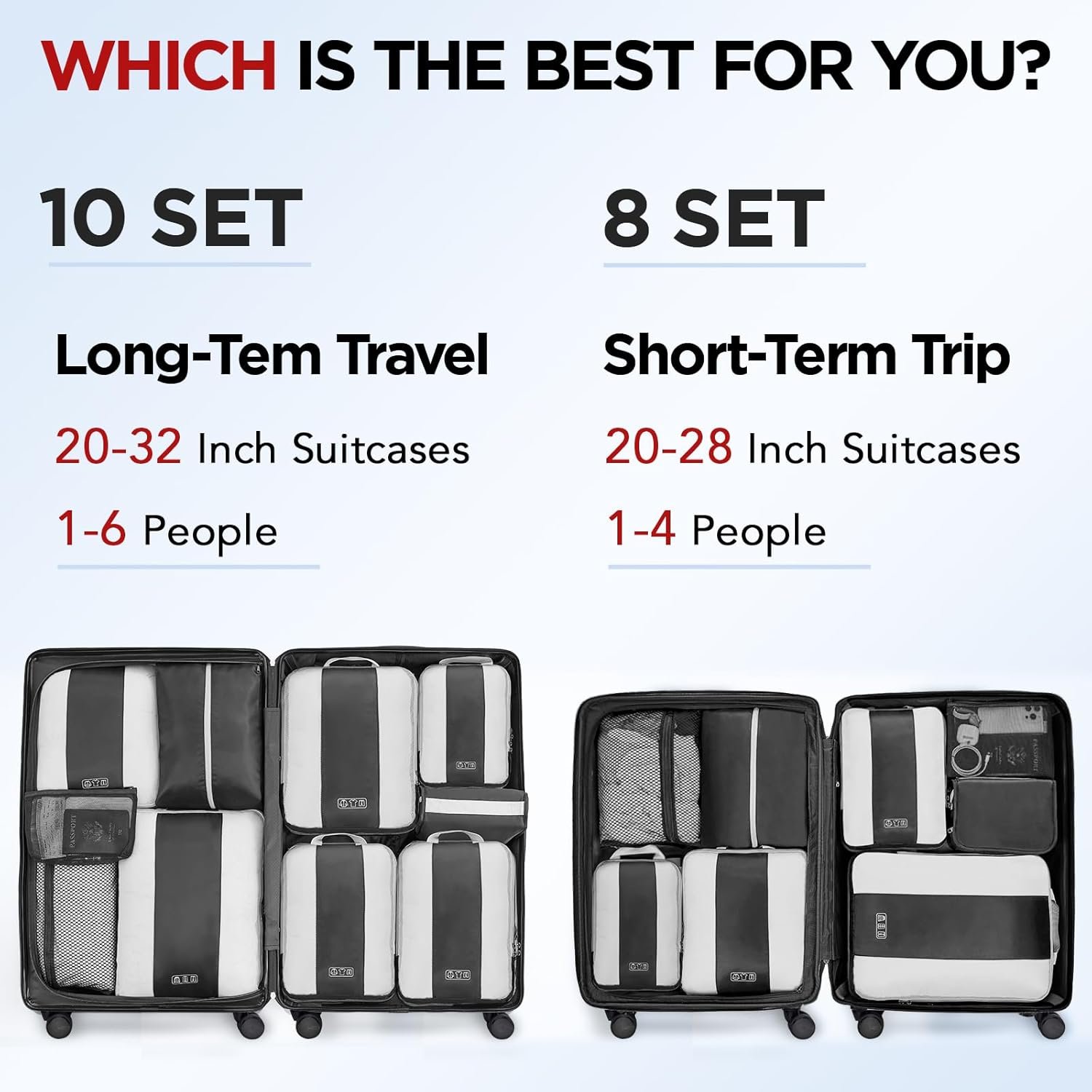 Ready for Any Adventure – Whether you’re heading out for a weekend getaway, a business conference, or a month-long backpacking trip, This high-capacity 10-piece compression cet seamlessly accommodates 20-32-inch suitcases of all types. We’re here to ensure you travel smarter, pack better, and enjoy every moment of your journey with peace of mind.