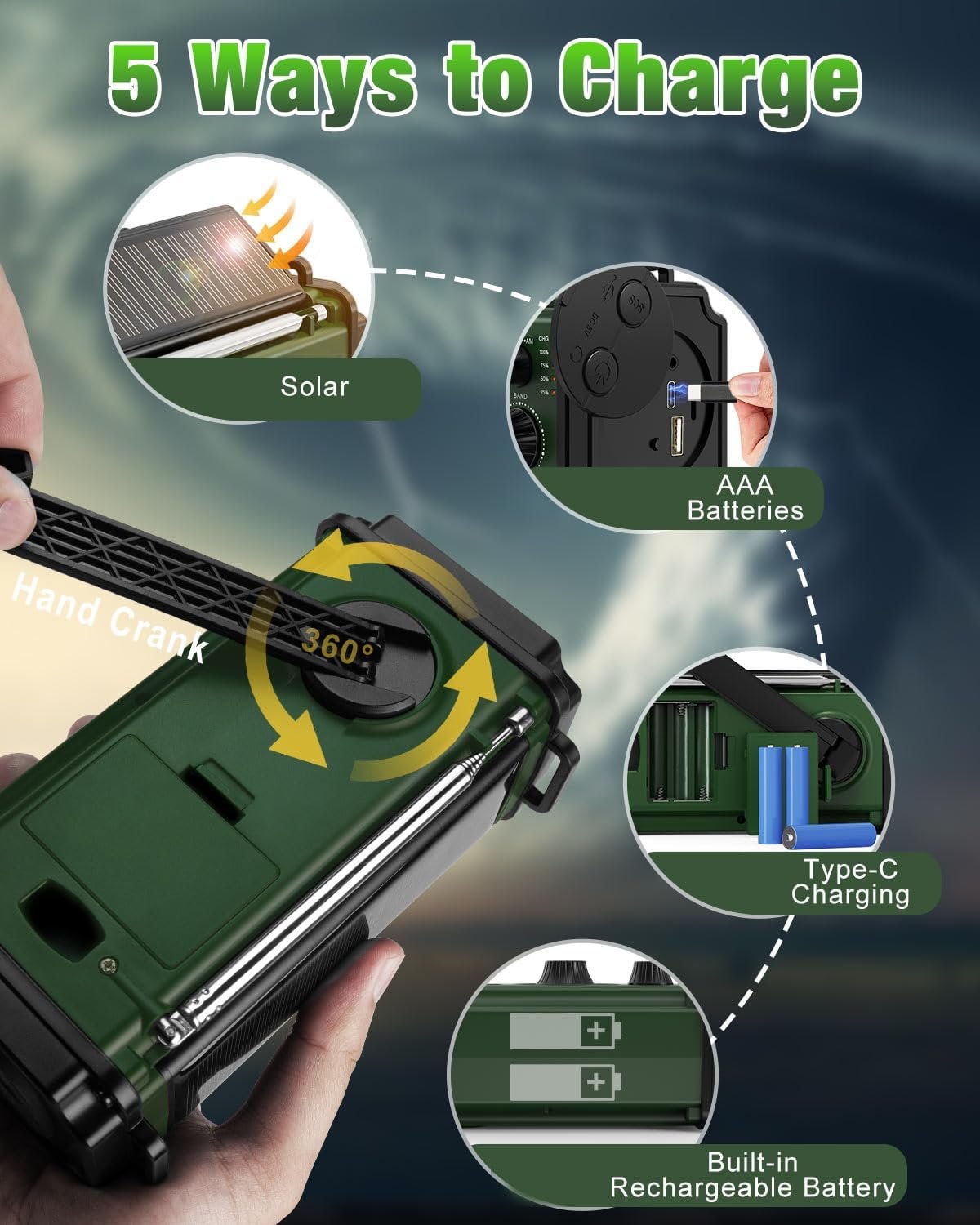 [4 Charging Modes]: This emergency radio supports a variety of power options to ensure you stay connected. Charge quickly and efficiently via USB Type-C, or use alternative power sources such as the hand crank, solar panel, or AAA batteries (not included). With these 4 charging options, you can ensure that the radio remains operational in any emergency, keeping you connected with the outside world.