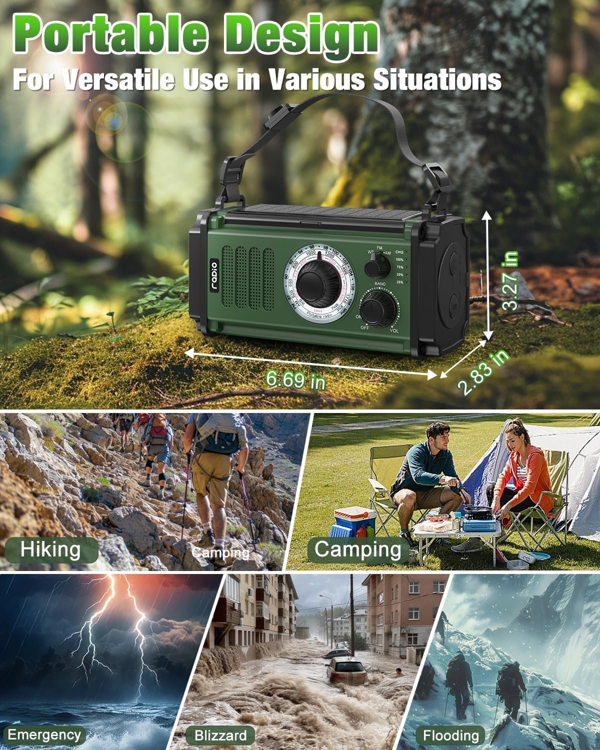 [Portable & Reliable Emergency Tool]: This portable emergency radio, measuring just 6.69*2.83*3.27in and weighing only 1.19lb, is perfect for carrying by hand or attaching to your bag. Easily fits into any pack, making it ideal for travel. In addition,we back our emergency weather radio with an 18-month Warranty. Our customer service is here for you 24/7 for anything you need! Add this emergency radio to your emergency kit with confidence!