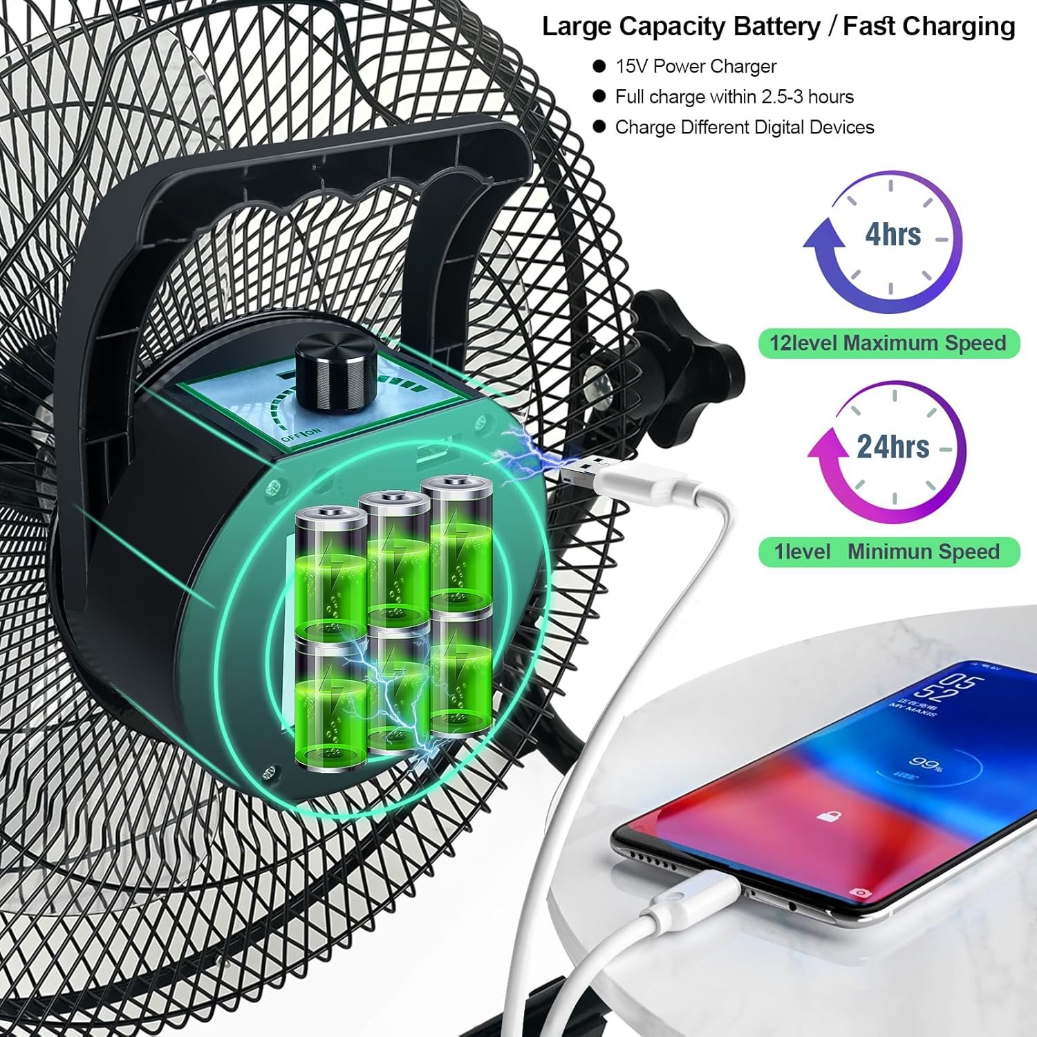 Powerful Air Circulation: Experience the power of our battery-powered fan with a three-phase, brushless DC motor with permanent magnet outer rotor. With a max air-flow of 2000 cfm, this rechargeable fan provides efficient air circulation. With its 120° angle adjust, you can direct cooling where it’s needed most. Stay cool and comfortable with air direction adjustable thanks to our state-of-the-art motor technology for smoother speed and reduced noise