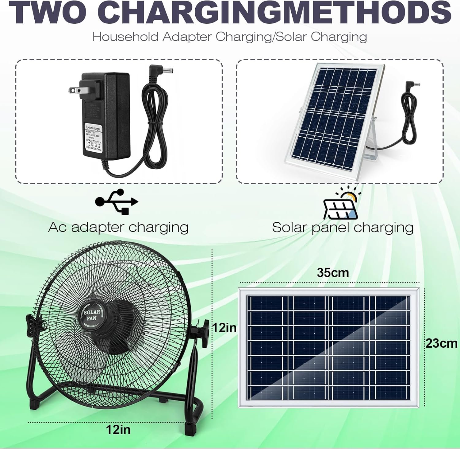 Rechargeable Fan: Enjoy unrivaled convenience with our innovative battery-powered fan with dual charging modes! Whether you prefer the reliability of traditional AC power or the eco-friendly benefits of solar power, our fan has you covered. Equipped with a AC adapter and an 20W solar panel, you can use solar energy to power your fan. Say goodbye to the hassle of outdoor charging and annoying electricity bills, as our fan is the perfect solution for indoor and outdoor activities alike