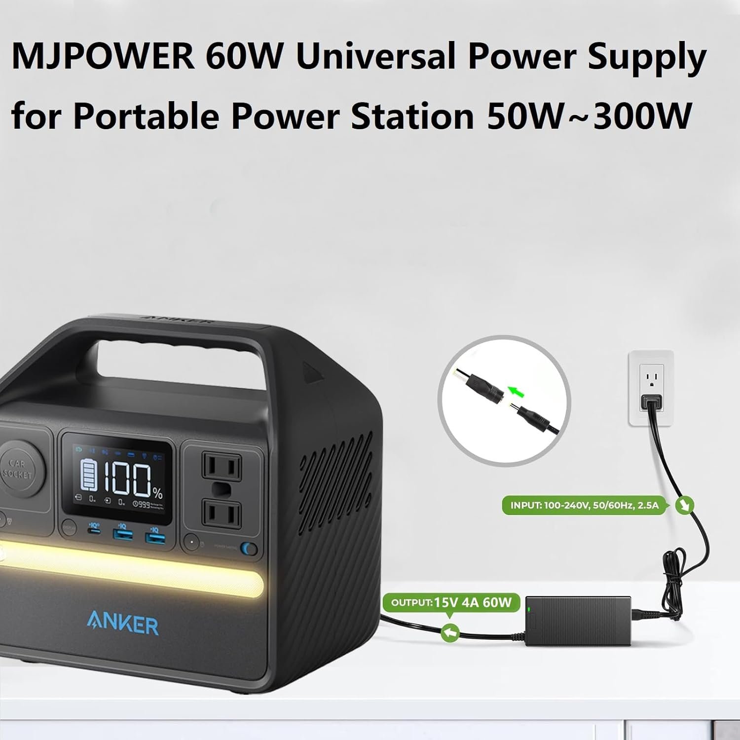 15V 60W AC Adapter Charger for Portable Power Station 50W to 300W Fit Anker/GRECELL/EBL/HOWEASY/FlashFish/SinKeu/ZeroKor/ENOFLO/AIMTOM/CTECHi/AIPER/MARBERO Solar Generator Power Supply Cord