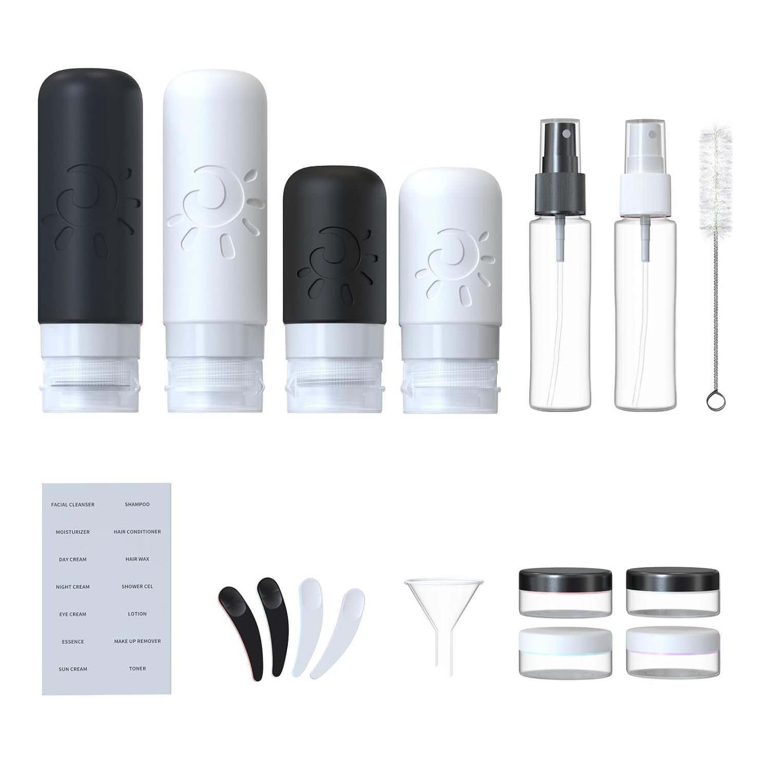 【Multi-combination Set】The travel container set includes 4 travel bottles, 4 travel jars, 2 spray bottles, 4 spoons, 1 funnel, 1 cleaning brush, and 1 label, as well as 1 transparent makeup bag. They are portable and lightweight, easy to carry and clean. perfect for business or personal travel, and fun outdoors.