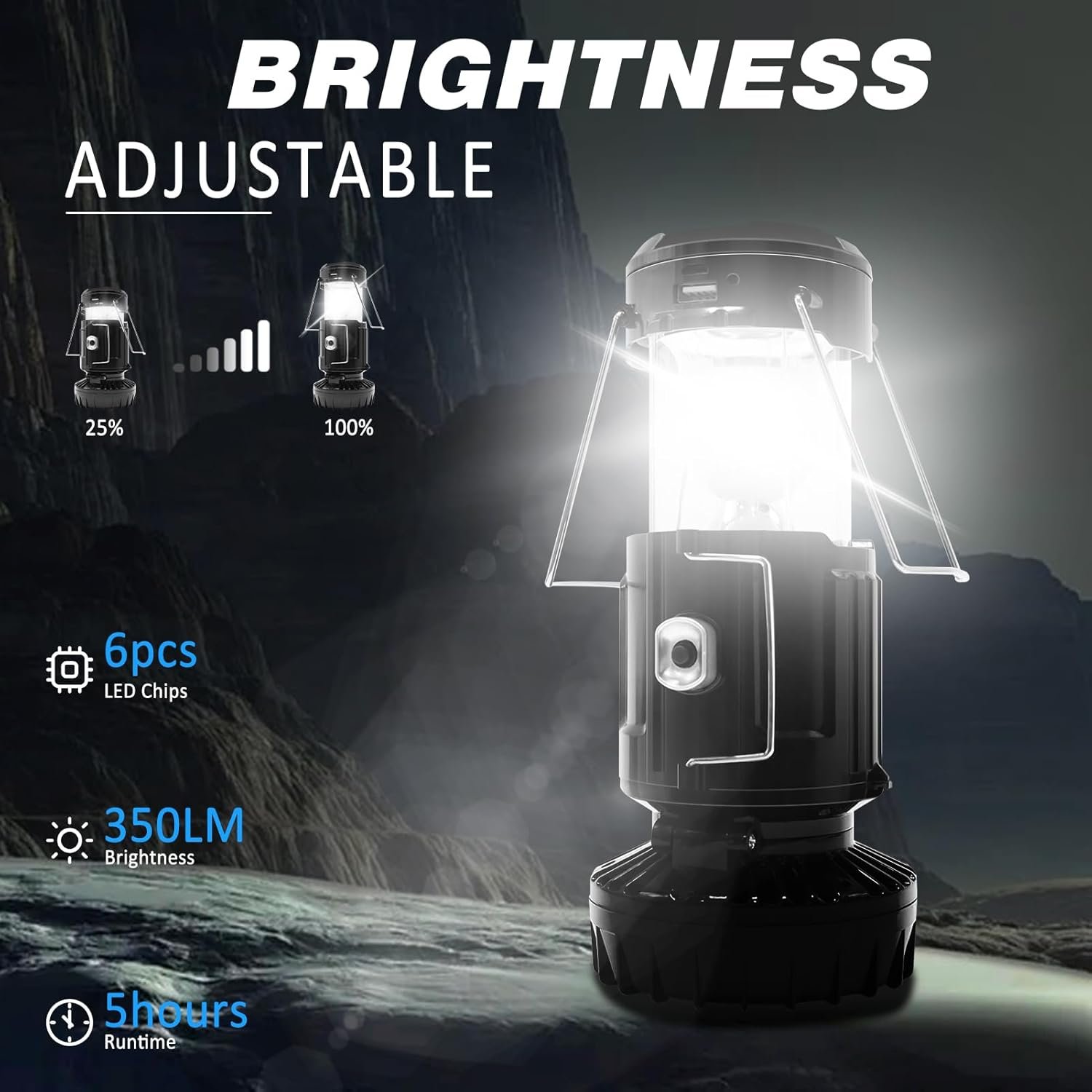 2 in 1 Lantern & Fan: Collapsible lantern design, 6pcs premium LED chips with 350LM Ultra Bright, adjusting brightness by pull up the lantern, provides 360 degree illumination. Portable Tent Fan provide high airflow, great for circulating the air and keeps you cool.