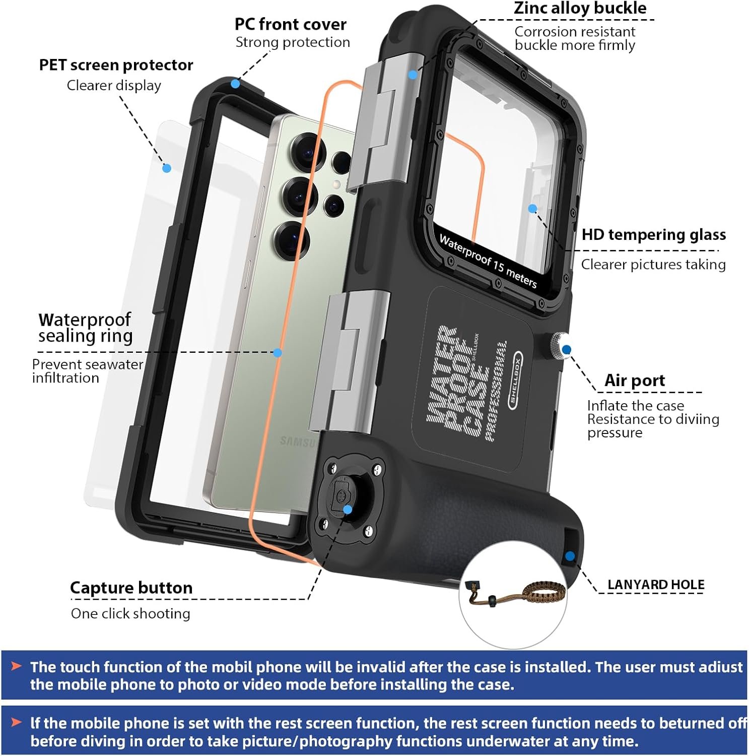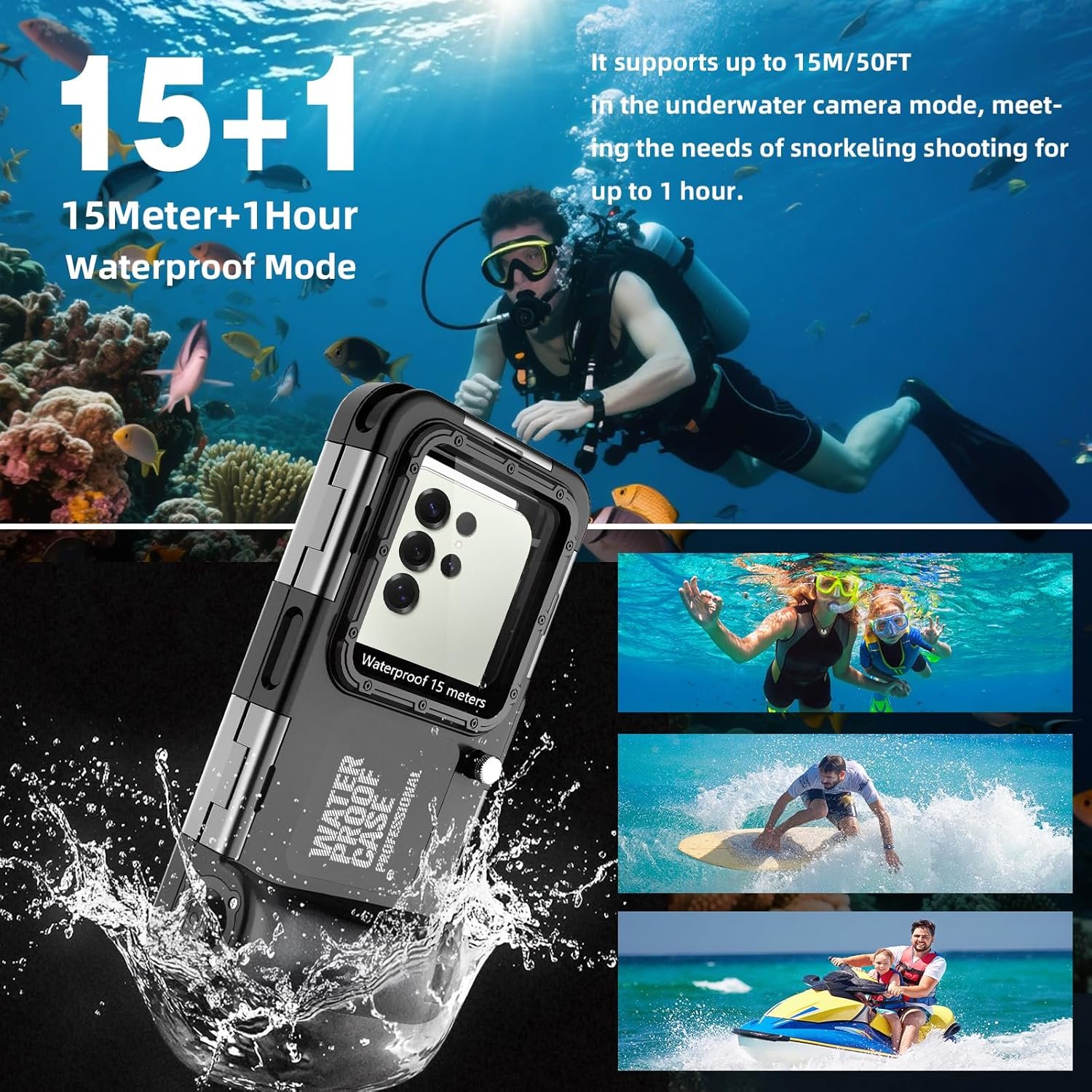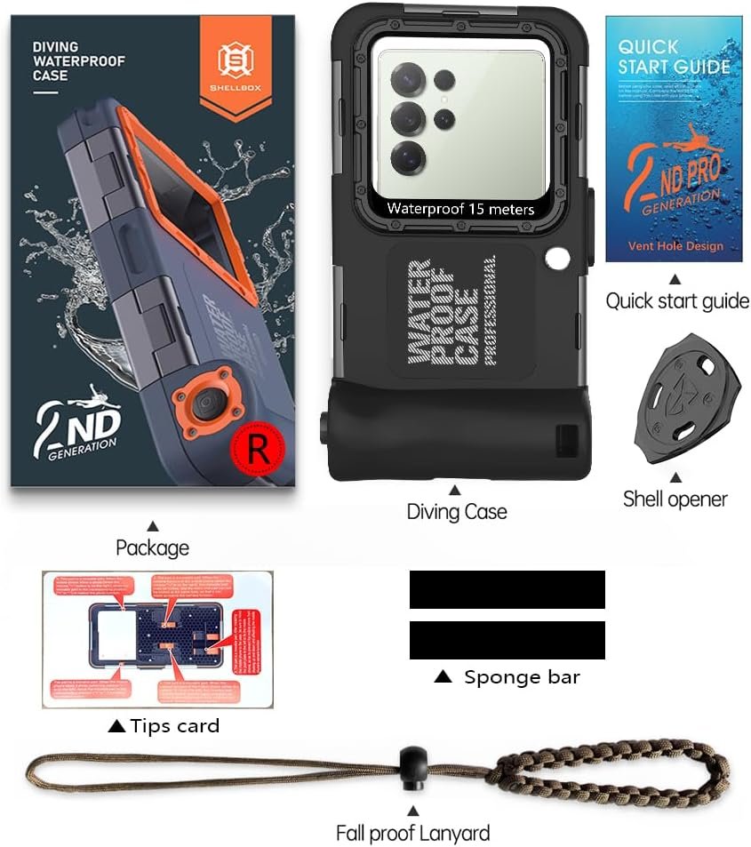 ►【Upgraded 50ft/15M Maximum Diving Water Depth】We use high-quality IP68 waterproof and water pressure resistant sturdy materials to upgrade the maximum diving depth of the diving case from 10M/33FT to 50M/15FT, which greatly improves the waterproof and pressure resistance of the diving shell. If you and your family or friends are outdoor enthusiasts who like any water or underwater sports, then this upgraded diving shell will definitely become your best partner for travel or vacation.