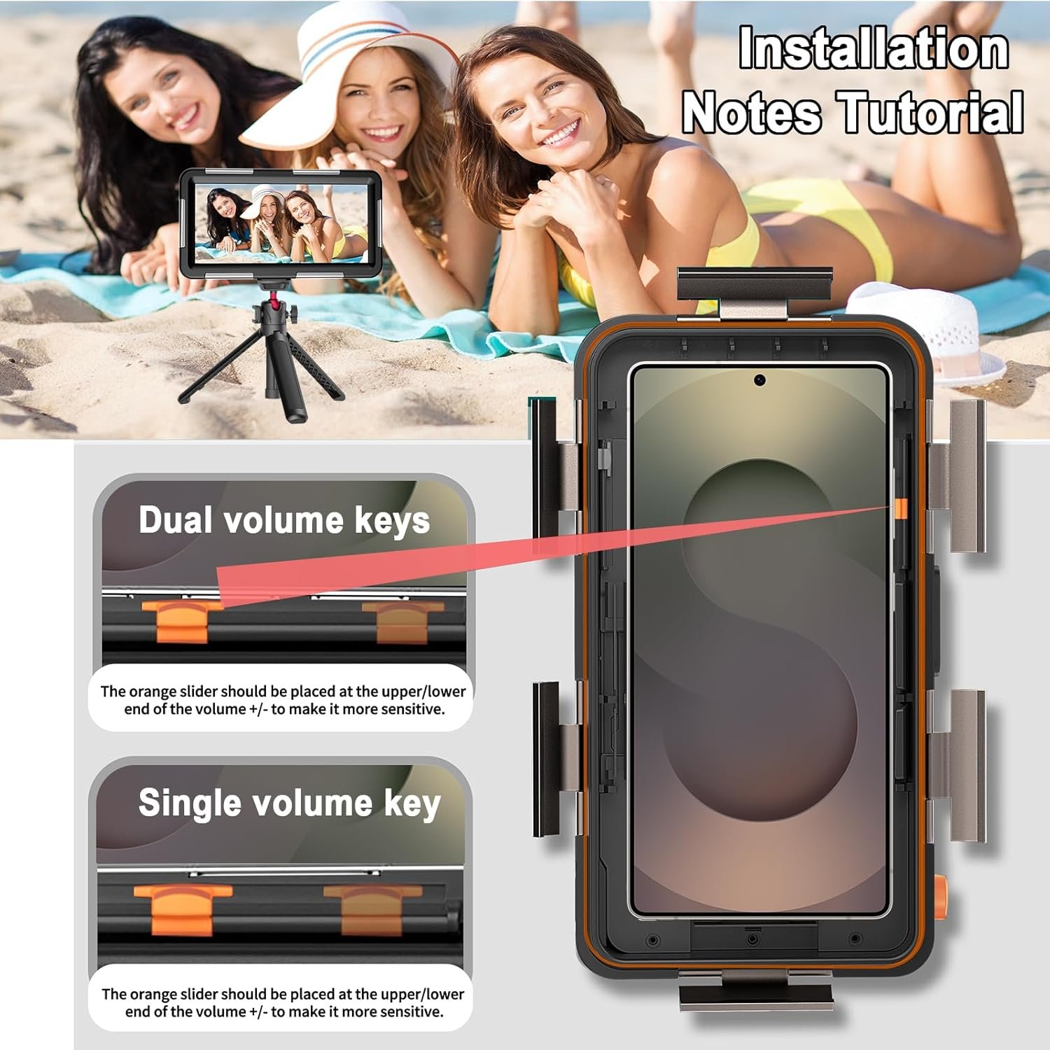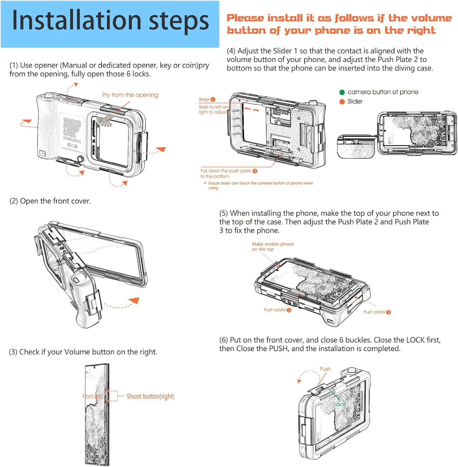 ►【Upgraded Compund Metal Fasteners and Snap】The underwater housing uses advanced composite metal fasteners and folding snap , which are more durable and tighter. There is a shutter and two phone body fasteners on the right side of the protective case, which is suitable for phones with the volume button on the right side. Easy control to take beautiful images when underwater. It also has a phonograph tripod steady point, you can also install it on professional photography equipment like monopod, tripod or stabilizer.