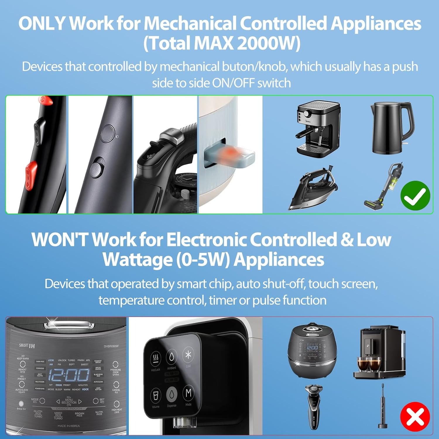 【NOTE】The 2000W AC socket is designed for use with electrical products that feature simple mechanical motors, but it is not suitable for low-power electronic devices (0-5W), such as electric shavers or toothbrushes. The dual adapter does not convert voltage, so do not connect devices rated for 100V-125V to it. It also cannot be used with devices that exceed 200W or those with overvoltage protection. Always verify the safety specifications or the label on your device before use.