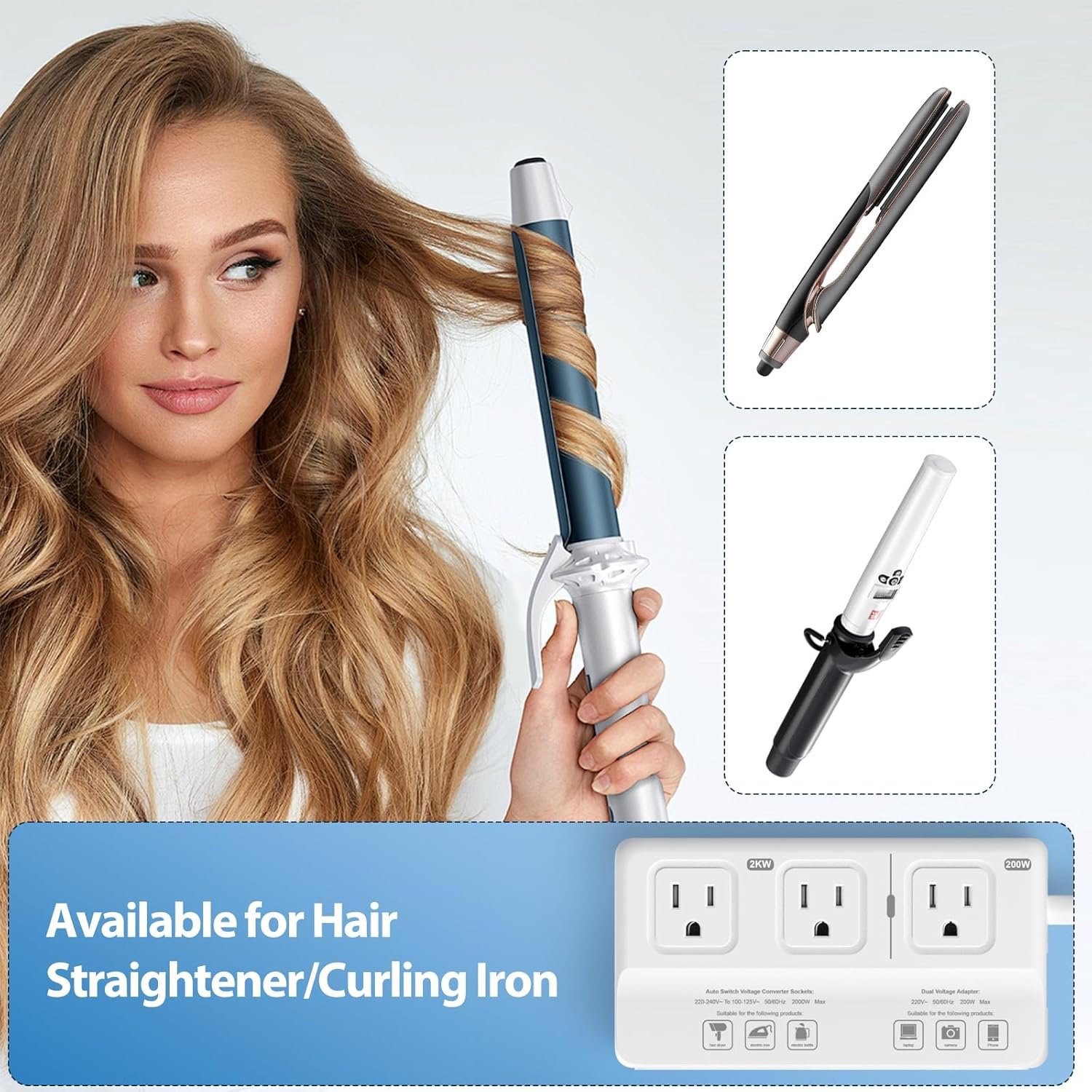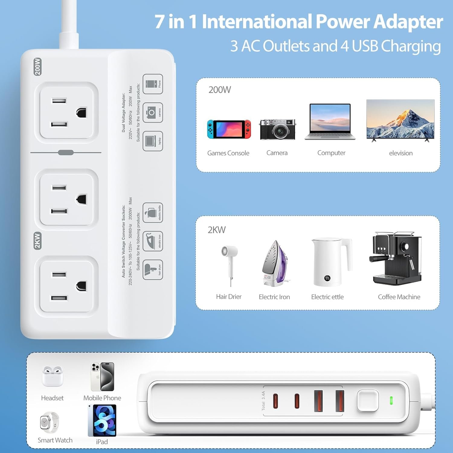 【Different Modules Voltage Conversion】The converter area is support maximum 2000W total voltage peak convert outlet, it converts voltage(220-240V,50/60Hz) to US voltage (110V,60Hz), such as kettles and other household appliances. The 200W adapter area is support maximum 200W voltage peak convert suitable for electrical appliances with voltages of 100V-240V. Idea for laptop, smartphone, tablet, camera, etc, ensuring you stay connected and in charge, regardless of your global location