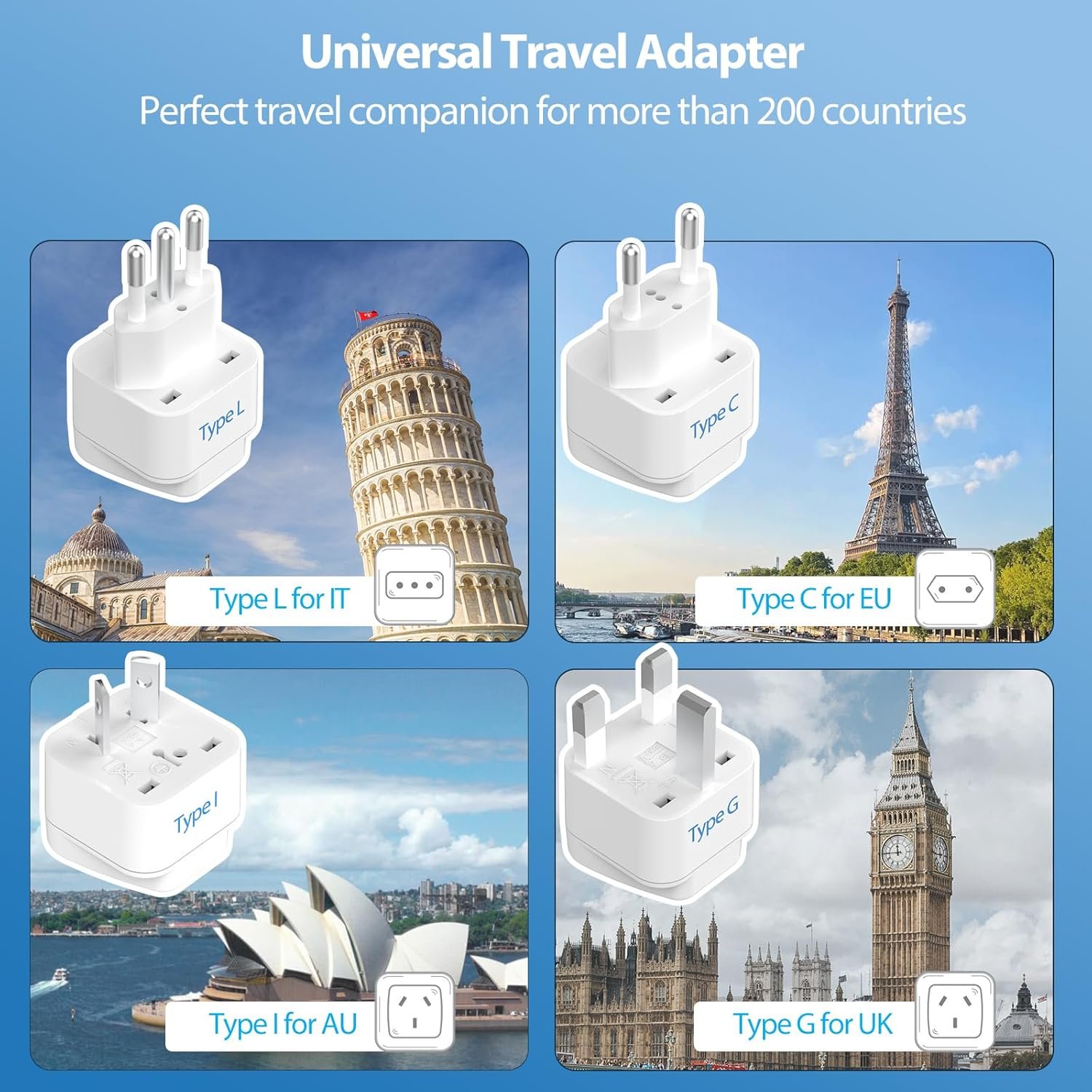 【Travel Voltage Converter】The 220V to 110V converter adapter combo equipped 1 DE power cable and 4 International adapters (type C G, I, L); it’s your good travel companion across United Kingdom, European, Italy, Australia, France, Germany, Spain, Greece, South Korea, Netherlands, Norway, Poland, Portugal, China, Dubai, England, Fiji, Hong Kong, Ireland, Argentina, New Zealand Russia etc, more than 200 countries over the world, ideal for charging your multiple devices when traveling abroad