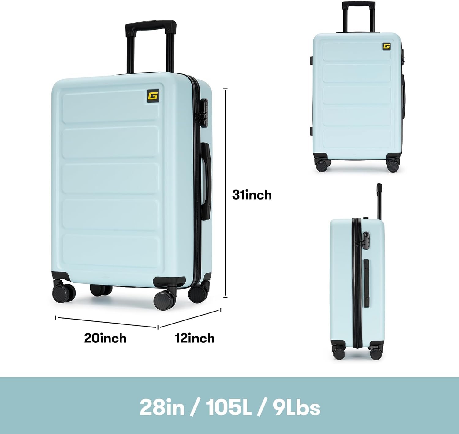 28″ Checked Large Luggage (includes wheels) : 31 x 20 x 12Inch,9Lbs, 105L.This is a large checked luggage that can be used for family travel, camping, vacation, weekend travel, shopping, studying abroad, etc