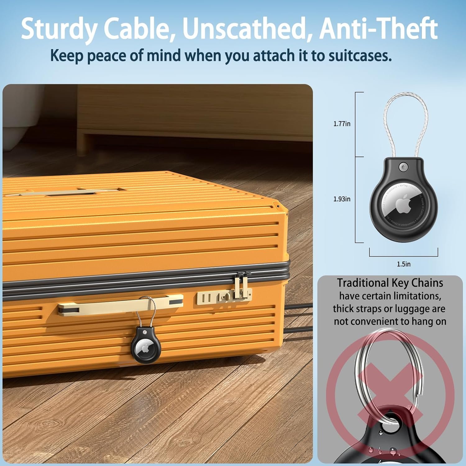 【Ultra-slim & Freely Compatible】: 2 mm diameter of Wire cable can go through all keyholes. You can track your key so no worry about your keys misplacing. for air tag case has long enough cable to go through luggage. It’s perfect for attaching it to suitcases, so you can confirm the location of the luggage. Don’t worry about losing your luggage when you travel by plane