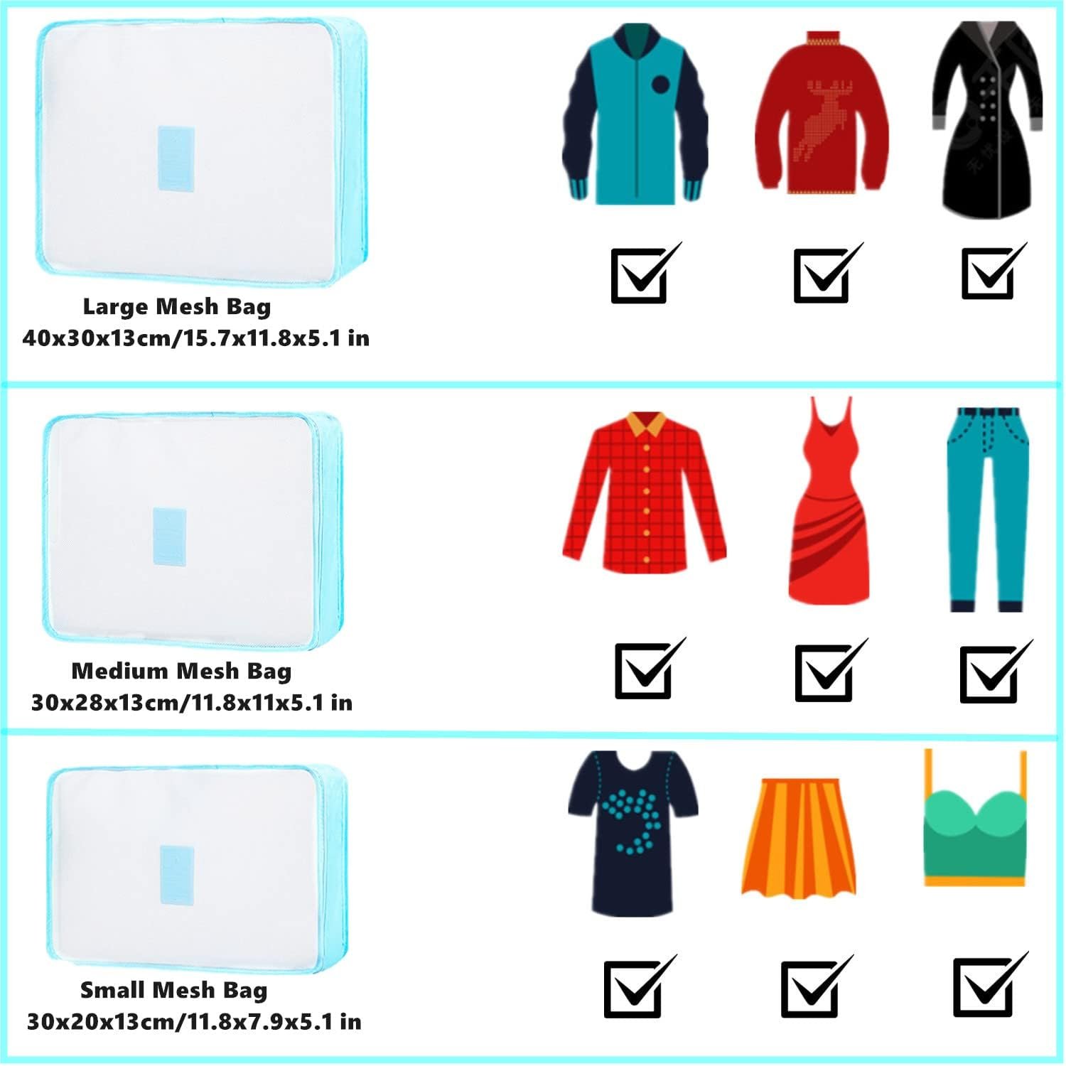 🎀 Value Set: You will get 6 pcs set travel packing cubes,they are in different sizes of 3 mesh packing cubes and 3 laundry pouches, Allows you to easily store and makes it easy to pack and unpack. Satisfy all your different travel needs. Make full use of the space in your luggage.