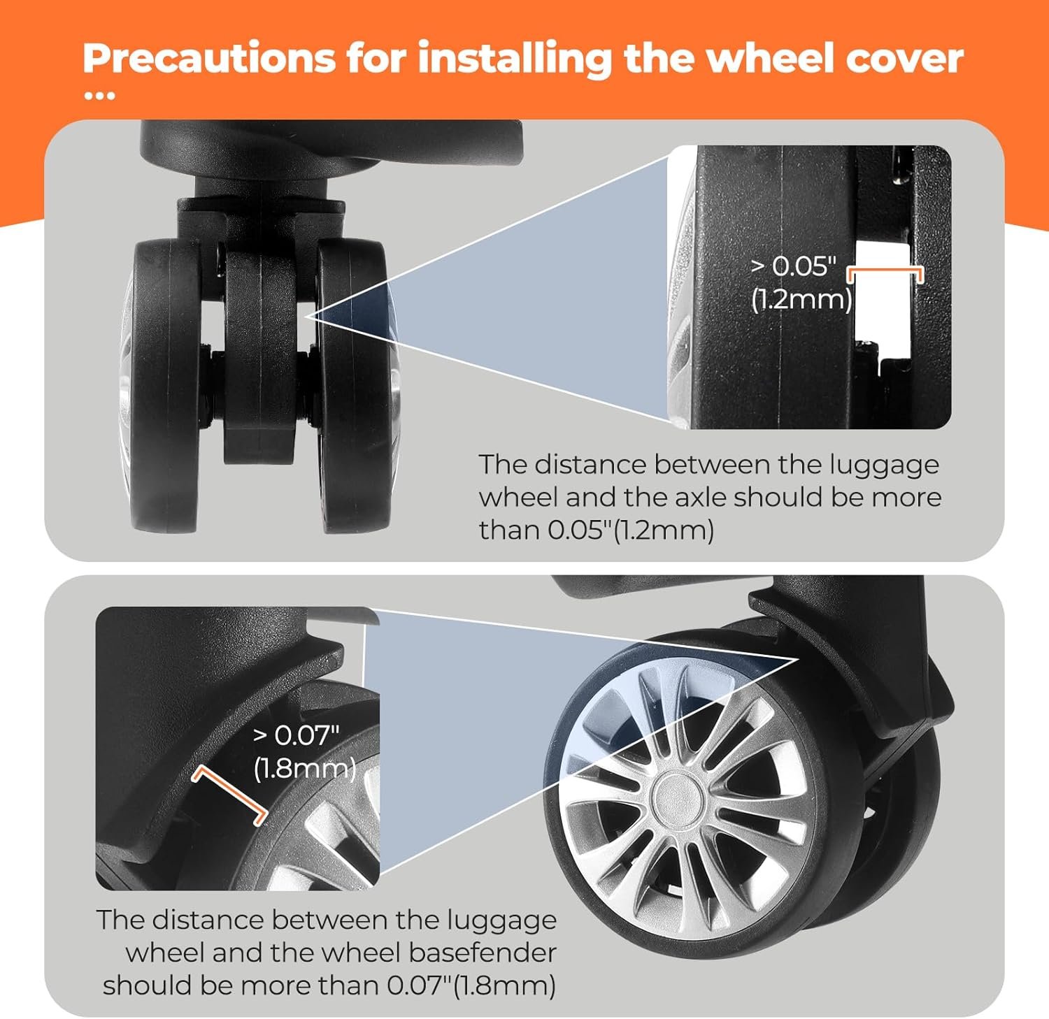 [Fits Most Suitcases] These suitcase covers for luggage wheel are suitable for suitcases with wheel diameter between 2.0-2.4″(50-60mm),the distance between the luggage wheel and wheel base fender should be more than 0.07″(1.8mm),and the distance between the luggage wheel and axle should be more than 0.05″(1.2mm) ,This Suitcase wheel cover for luggage Suitable for 4×2 double wheels, not suitable for 4×1 single wheels luggage