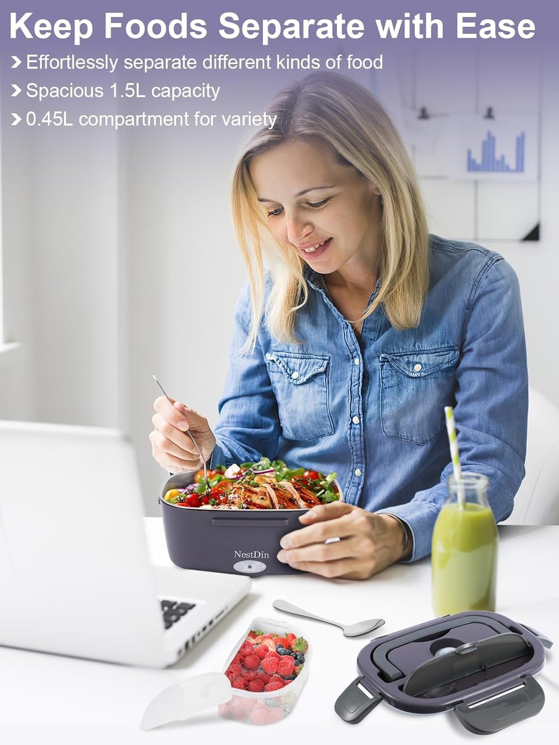 Generous Capacity with Extra Fruit Box – Pack a full, satisfying meal with 1.5L of space plus a 0.45L fruit container. This lunch warmer portable for work keep your mains and snacks fresh, separate, and ready to enjoy when hunger hits
