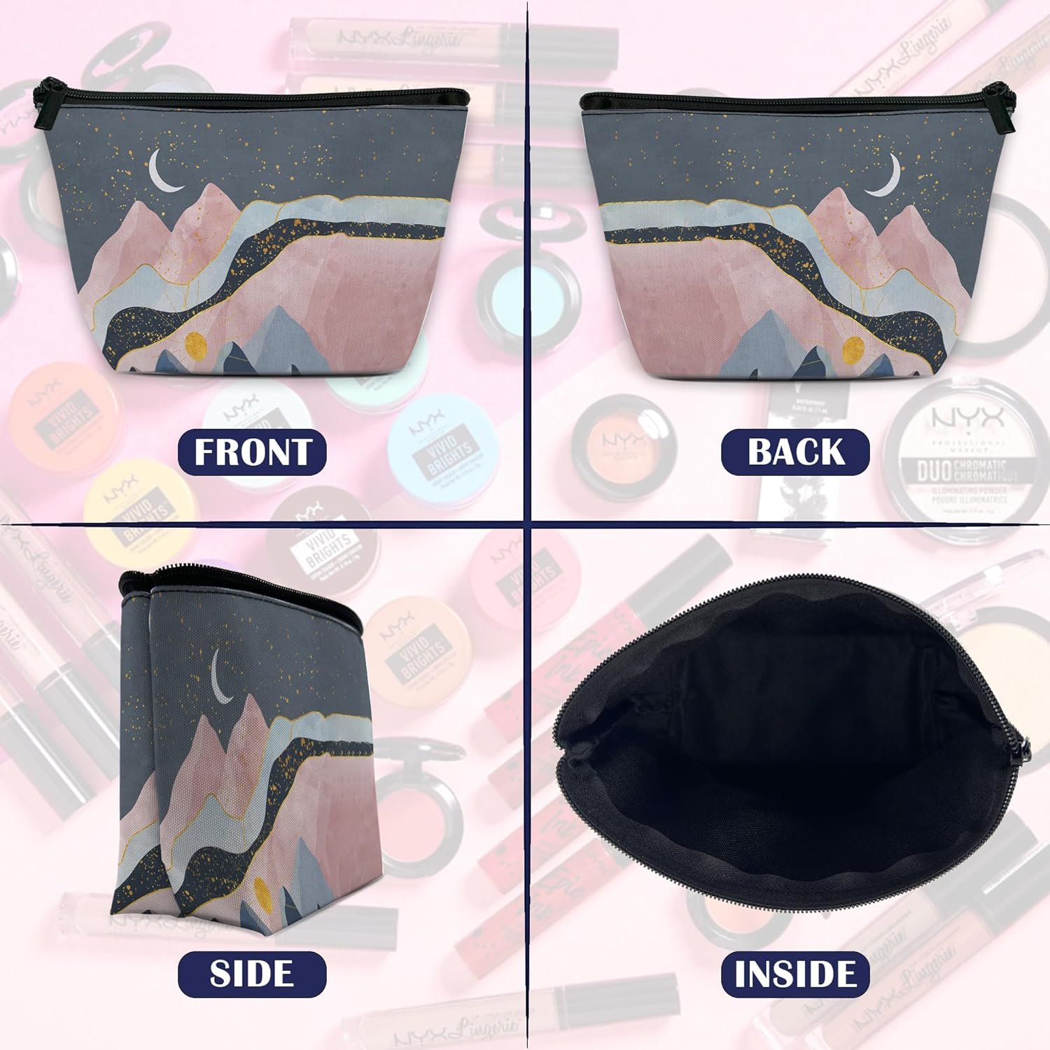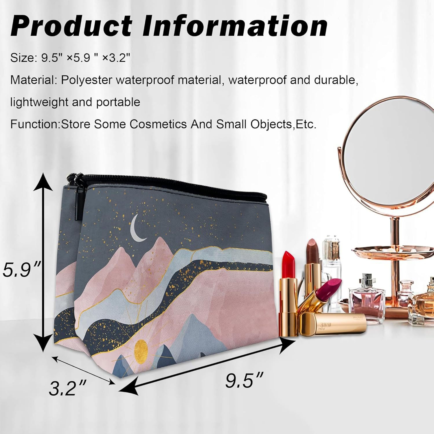 Abstract Mountains Makeup Bag for Purse, Waterproof Funny Sun Moon Stars Cosmetic Bag for Women, Zipper Travel Toiletry Pouch Gift 9.5×5.9 Inch