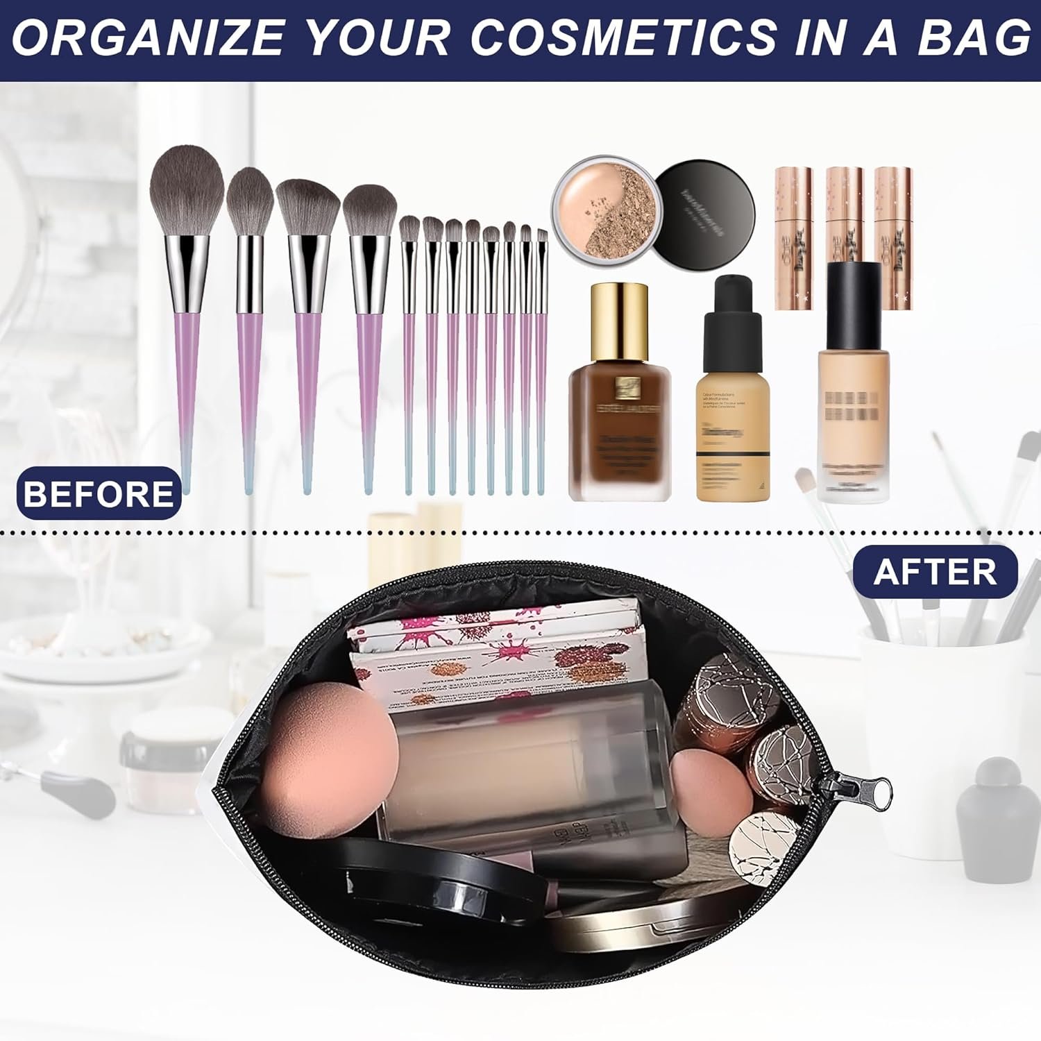 【LARGE CAPACITY】 This makeup bag can store not only your cosmetics, but also charging cables, cell phones, essential oil, toiletries, skincare and so on. Keeps all your stuff well so you don’t have to go looking for everything all the time.