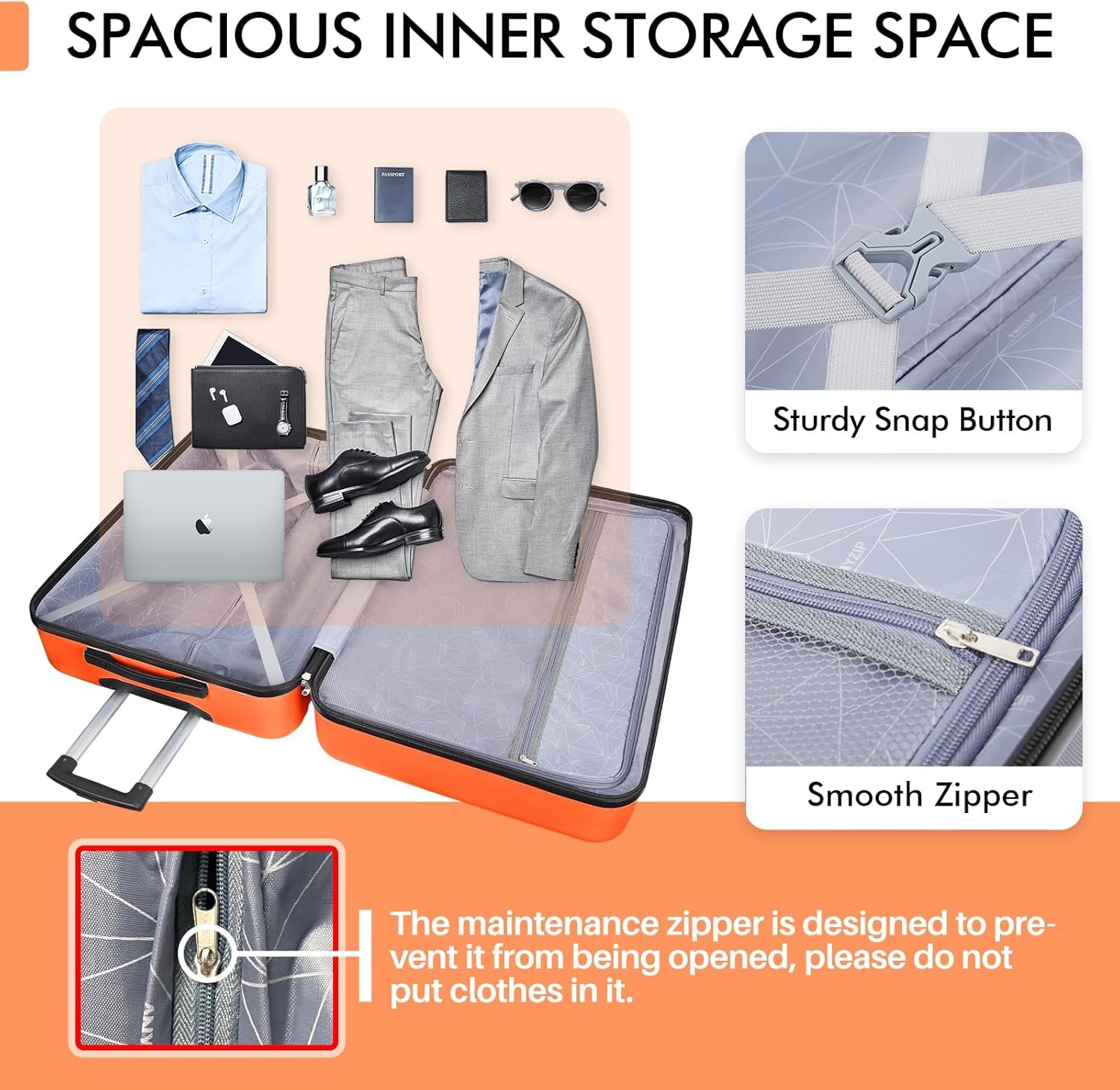 [Larger storage space] We have adopted a more scientific structure design to maximize the use space in the box, and reasonable internal partitions make your luggage more tidy and can accommodate more.