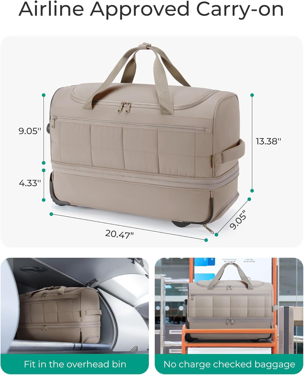 Airplane Approved: Travel friendly carry-on rolling duffle bag meet the size requirements of most International Air Transport Association flights, underseat also the overhead compartment