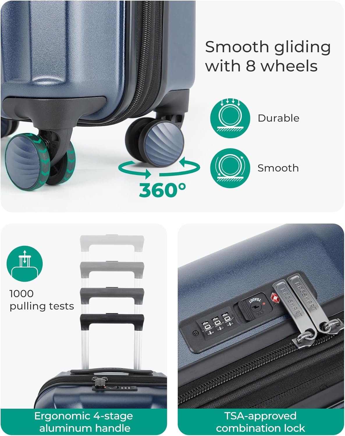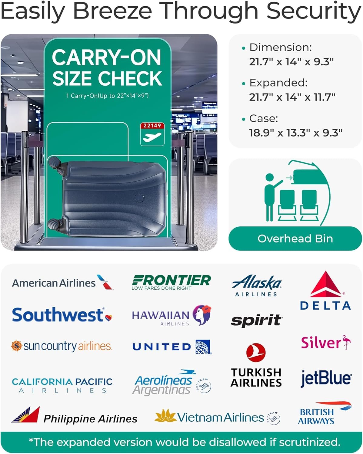 Versatile Travel Companion: Designed for the modern traveler, this sleek carry on luggage 22x14x9 airline approved measures 21.7″ x 14″ x 9.3″ and weighs just 7.72 lbs, making it the perfect companion for couples, solo adventurers, business professionals, and families alike. Whether you’re planning a weekend getaway, a romantic vacation, or a quick business trip, this carry on luggage with wheels adapts to your unique travel style