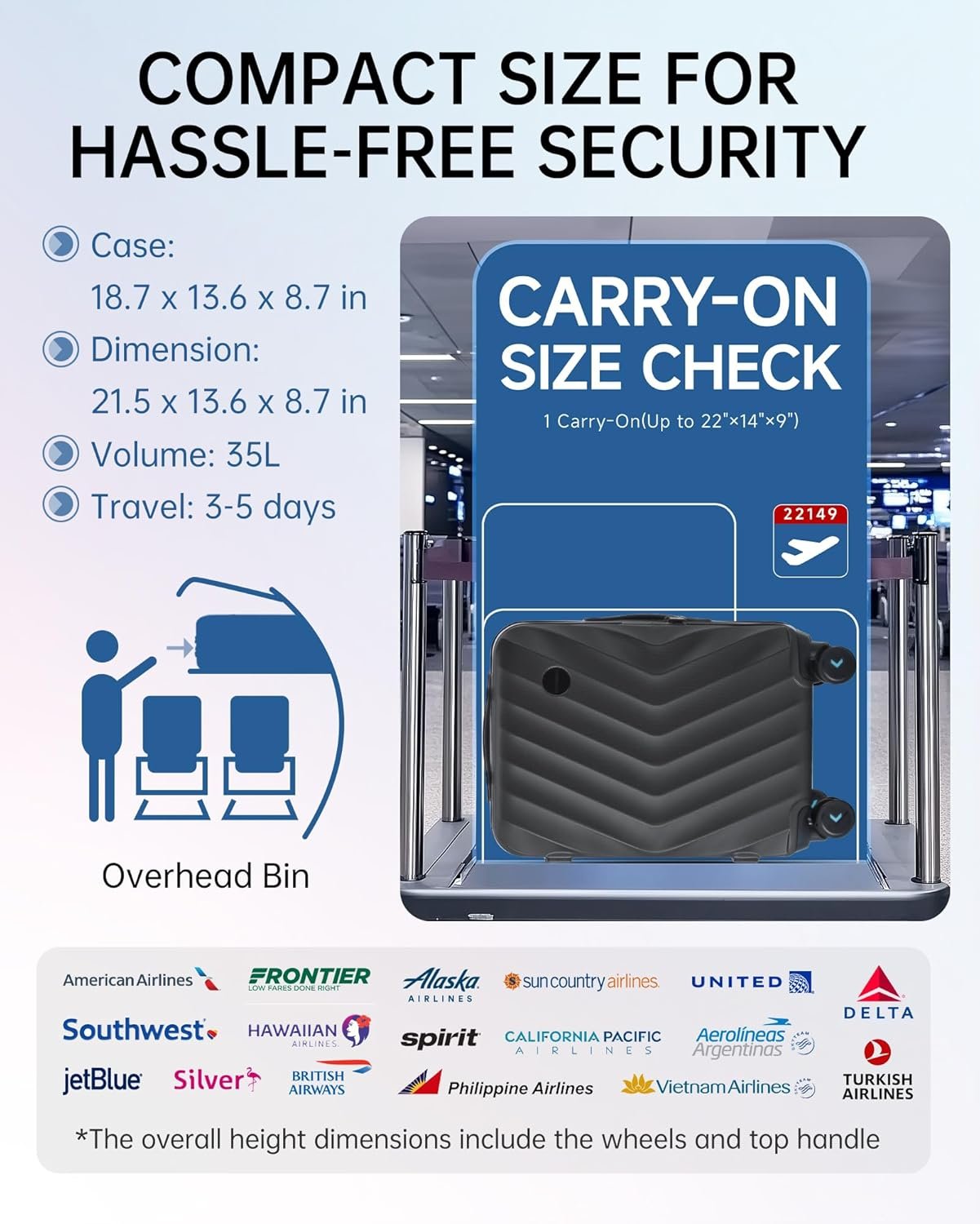 COMPACT CARRY ON SIZE- Airline approved carry on luggage fits in overhead bins of most major domestic airlines while allowing for more packing capacity. 20 inch luggage is suitable for 3-5 days travel, airplane, train and car trips alike. Lightweight carry on allows you to make better use of weight allowance without any effort. Carry on suitcase dimension: 21.7 x 14 x 8.7 in (spinner wheel and handle height included). Volume: 35 L. Weight: 6.39 lbs