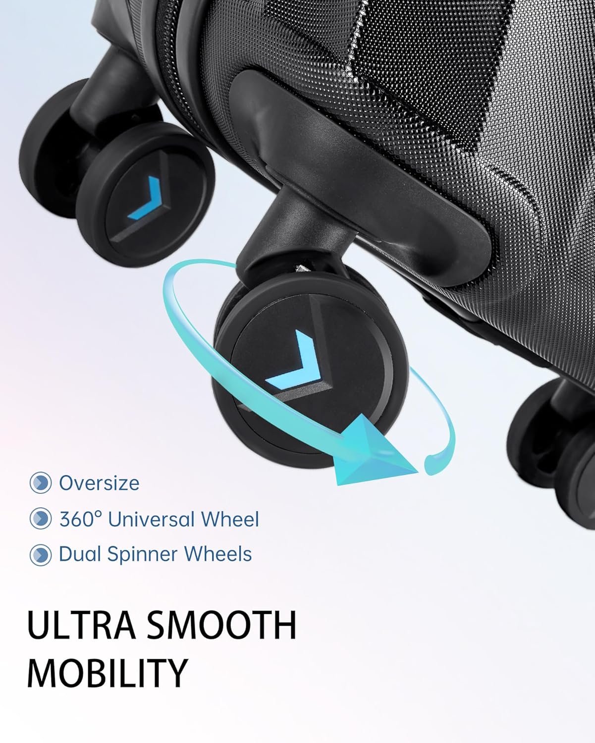 EASILY MANEUVERABILITY – 360° spinner dual wheels roll smoothly over multiple surfaces, like carpet, rougher terrain even gravel, and handle bumps yet tight corners well. The extension handle is molded for comfort and durable, which is made from aluminum and can be adjusted four-stage to suit different heights. TSA approved combination lock to keep your belongings safe and secure be opened by security customs easily (The combination lock preset to 0-0-0. No key included in this luggage)