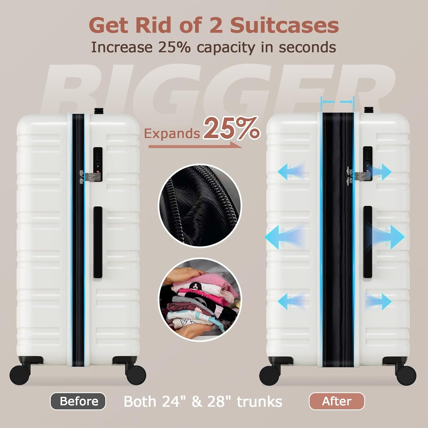 ▶Expandable Design for Versatile Travel◀ This luggage sets 3 piece includes 20”, 24”, and 28” suitcases. The 24-inch and 28-inch lightweight checked travel suitcases feature an expandable design, increasing capacity by 25% to accommodate extra belongings for longer trips. (Note: The 20” carry-on is non-expandable.) Perfect for families, frequent travelers, or anyone who needs flexible packing options.