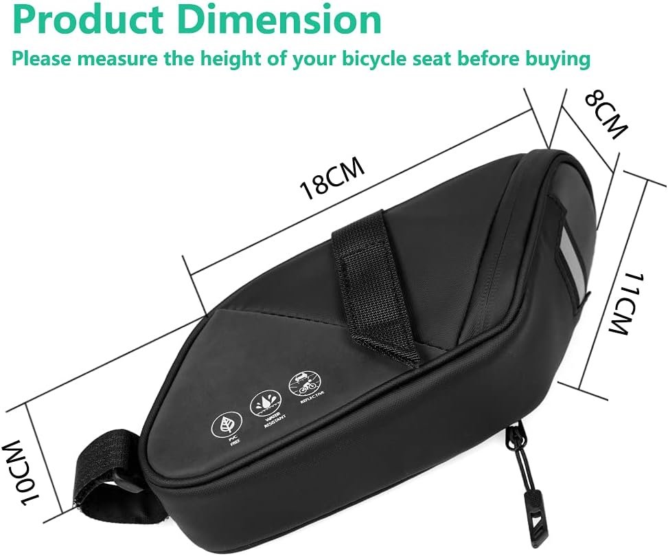 【HIGH QUALITY & DURABLE】Our bike seat bag is made of 900D Oxford Fabric, sturdy, stylish and in good shape, which offers well protection for your belongings. It has high tear resistance and prevents damage from friction, which guarantees that the bike saddle bag will use for a long time.