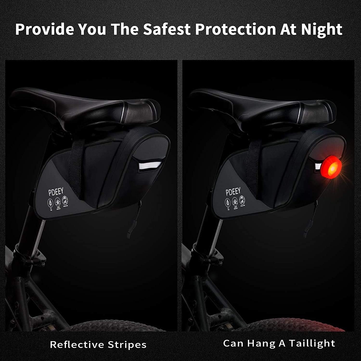 The bike seat bag has a large reflective area and strap which incrase night visibility while night riding. With this reflective area, this bike saddle bag will enhance your safety at night. At the same time, the design will bring a peace of mind to your family members.