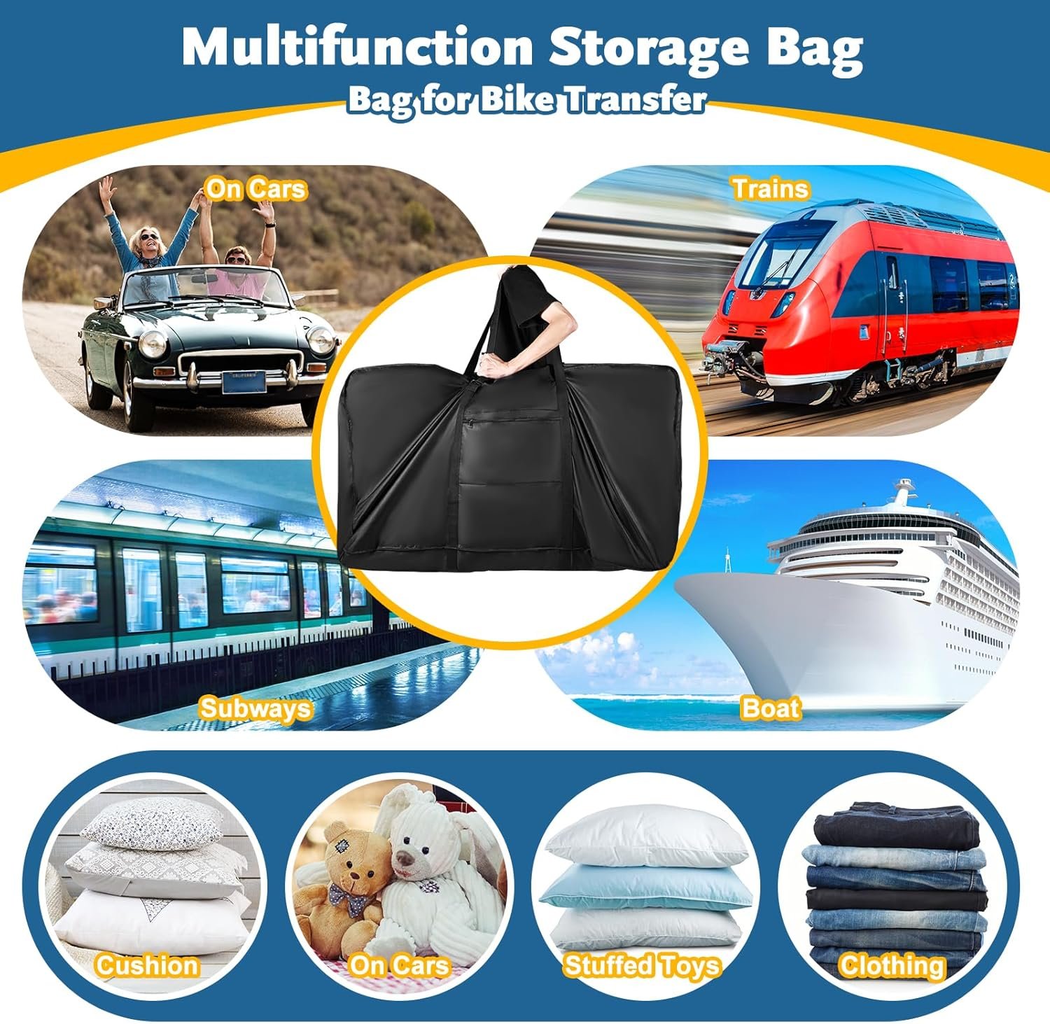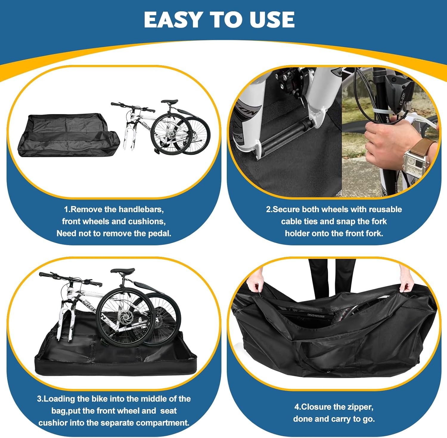 All-round Protection For Bicycle:Ideal for bike transport carrying, carrying bikes in cars, trains, air travel, shipping, subways, etc.Making your bicycle safe, reliable and dry.A bicycle travel case that truly resist the wind, rain, sun and snow.Warm Tips: Before putting the bike into the bike bag, please remove the front wheel and handlebar and keep the handlebar vertical.