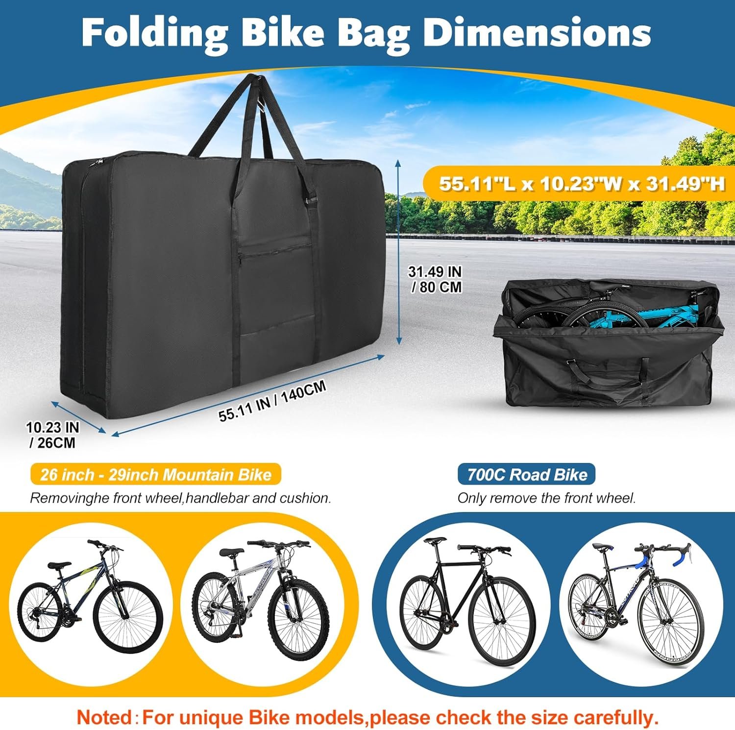 Fits 26 inch to 29 inch Bikes:Unfolded Bicycle Travel Case Size: 55.11 × 31.49 × 10.23 inch(140 cm x 80 cm x 26 cm); Bicycle Storage Bag Folded size: 17.32 × 11.41 × 3.93 inch(44cm x 29cm x 10cm).We recommend that you measure the size of your mountain bike (length, width and height) before buy.Do not install sharp ornaments on the bicycle, or it will damage the large bike bag.
