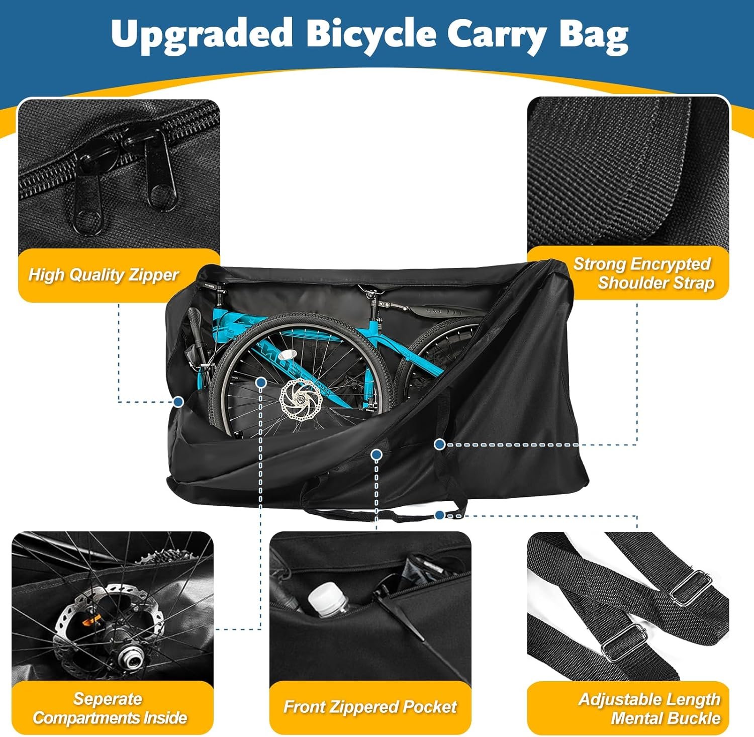 4 Details You’ll Love:①Strong and Adjustable Length Shoulder Straps:Enhancing the webbing strength which is enough to cope with carry burden for long times,carry the bicycle shipping box in an easy manner; ②Seperate Compartments Inside:To separate the bike and the wheel to prevent scratch from crash.③Front Accessories Pocket:To store bike tool accessories and small things.④Drawstring Storage Bag:Put bike bag in when not in use and secure the bag to handlebars, handbag or luggage rack.