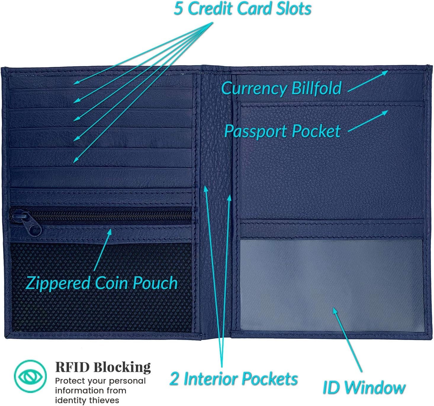 Features – The passport wallet contains a snug and secure passport pocket, deep currency billfold, 5 credit card slots, 1 clear ID window, zippered coin pouch and 2 interior pockets