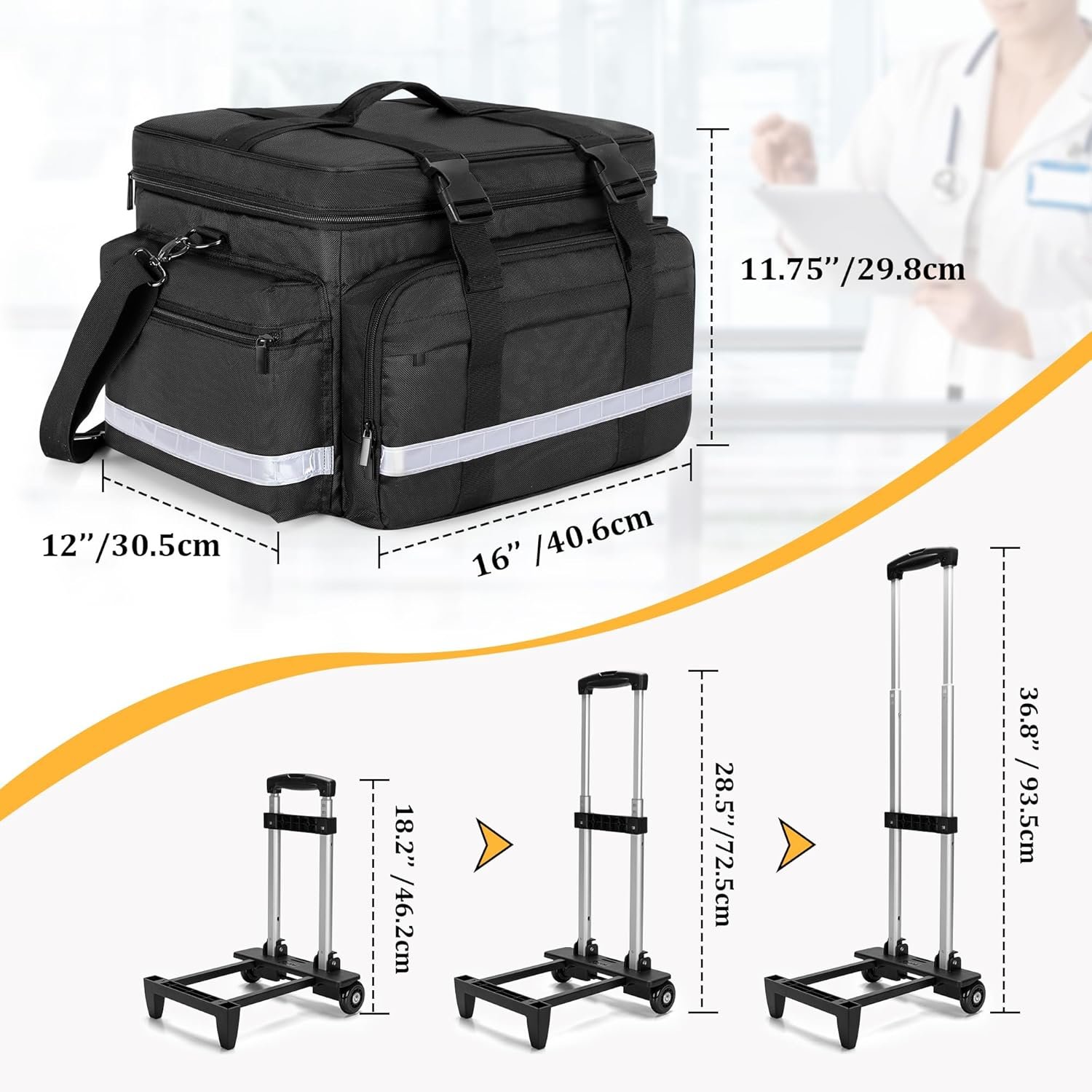 DIMENSION: 16’’ x 12’’ x 11.75’’. Our rolling med bag is perfect partner for home healthcare nurses, doctors, EMT and everyone in medical field. Keep all your supplies be prepared while caring patients.
