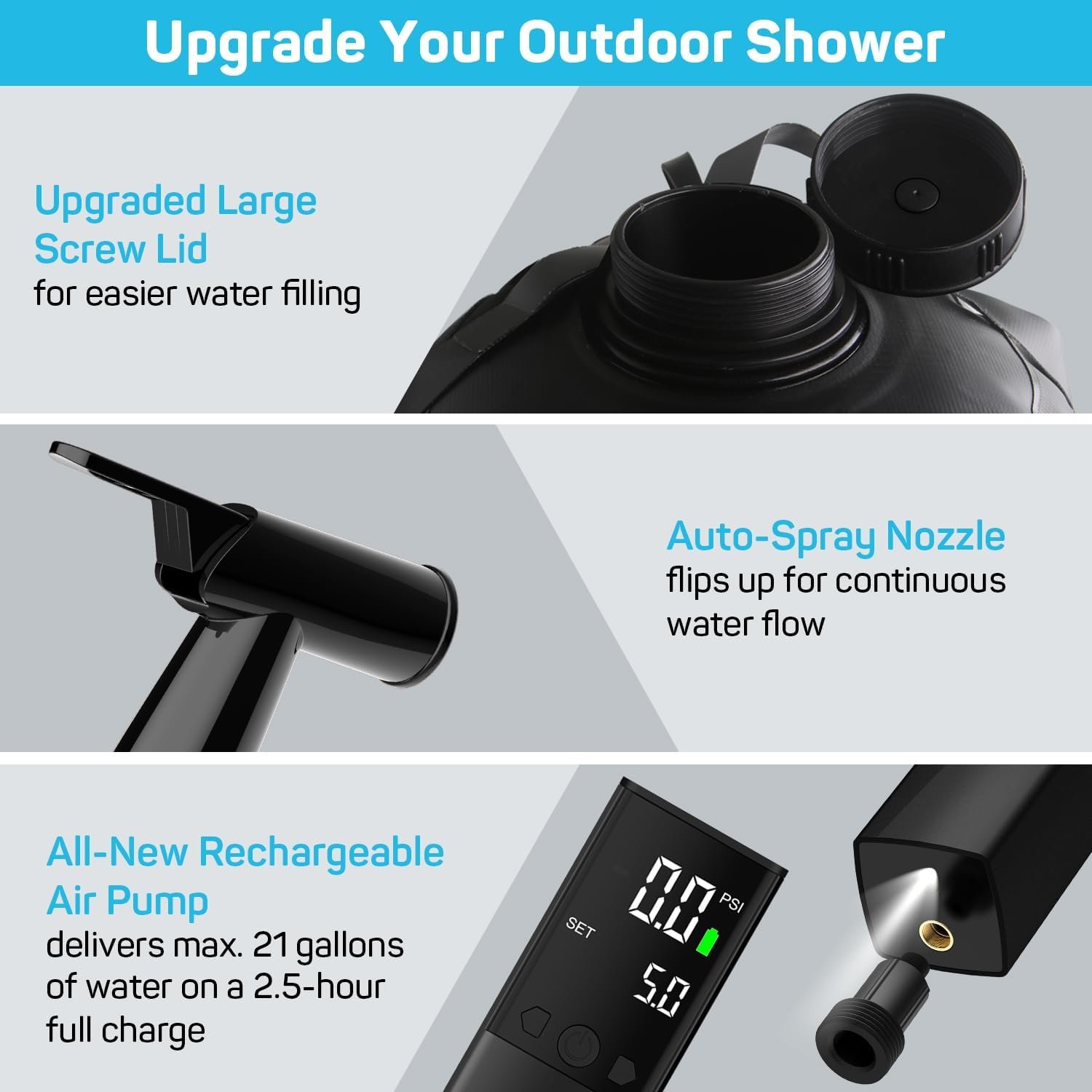 【Rechargeable Air Pump】Slimer than a 16oz beer can, the new rechargeable air pump can fully inflate your shower bag and get your shower ready shortly. Press the power button, hook it up to the shower bag, and let it do the rest. NOTE: we kindly advise you to fully fill the shower bag for the fastest pumping speed possible.