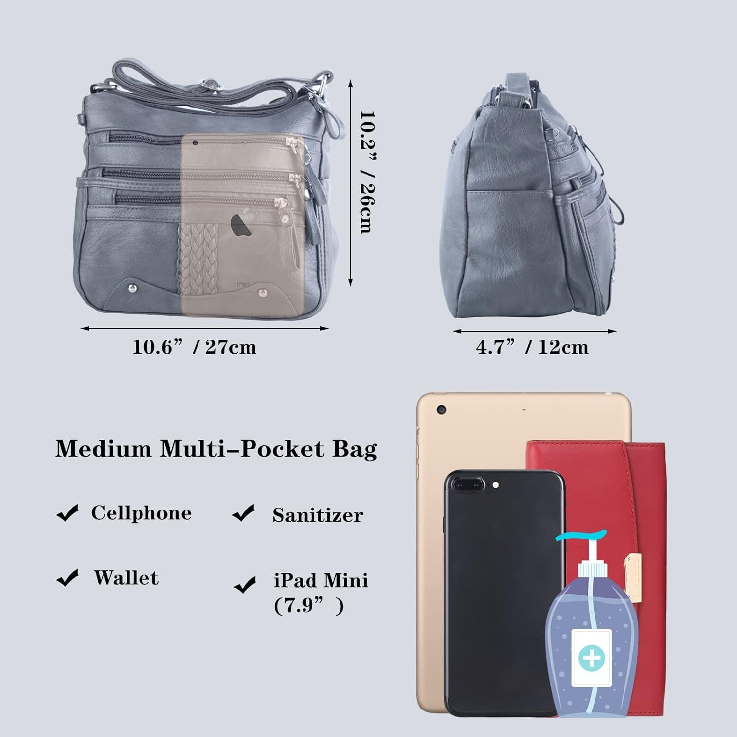 Big capacity. Spacious compartment can fit Ipad mini, cell phone, perfume, lipsticks, glasses, watch, keys. Free worry for outing.