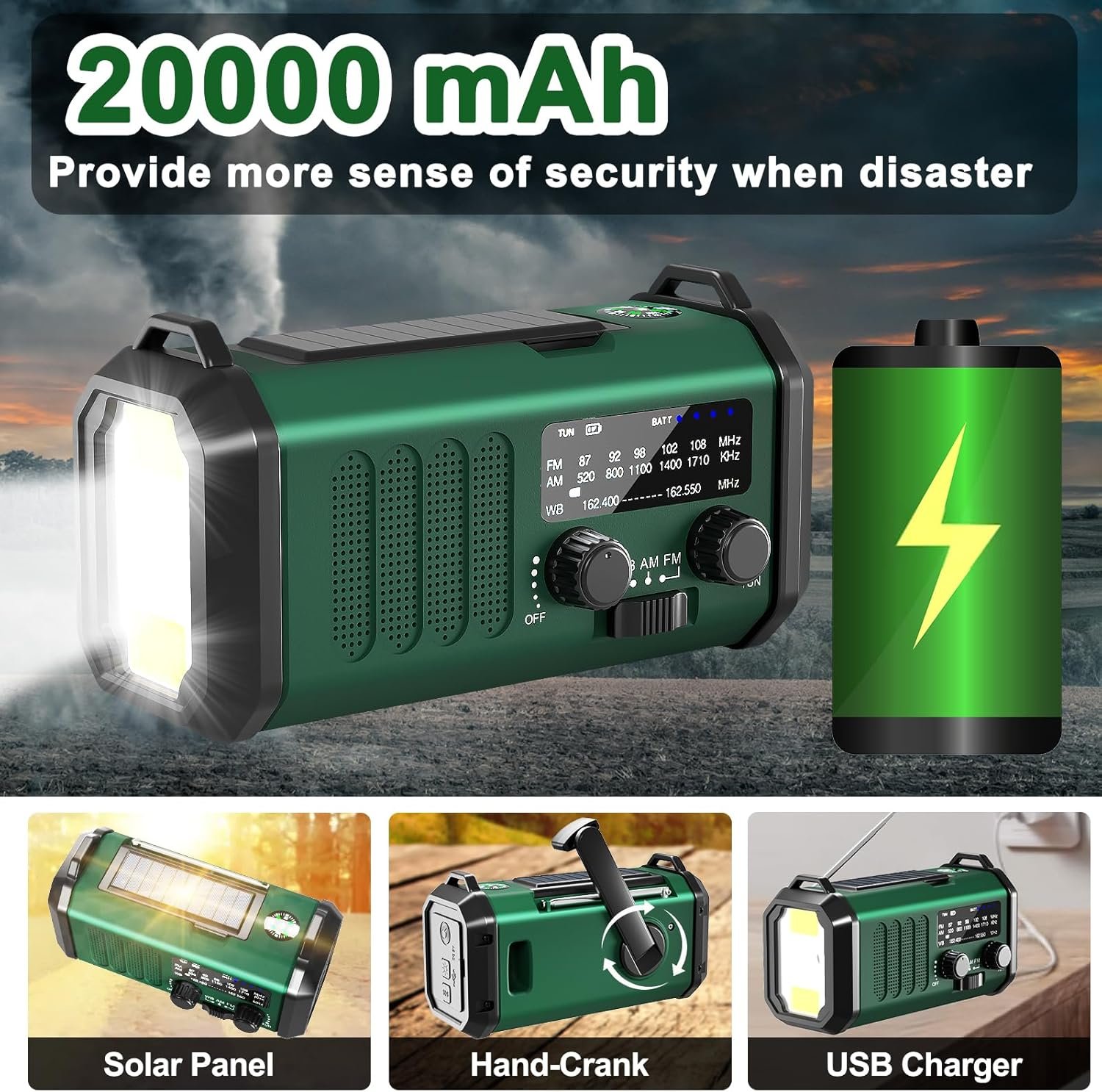 【20000mAh Ultra Capacity Emergency Radio 】Revolutionize your emergency preparedness with our 20000mAh Solar Radio! This weather radio comes with 20000mAh large-capacity rechargeable battery and solar panels, USB charge, Solar charge, Hand-crank could also supply the emergency radio last for days after the storm had passed until the power back on. No matter what emergency situation you find yourself in, this hand crank radio that you will never be without power,