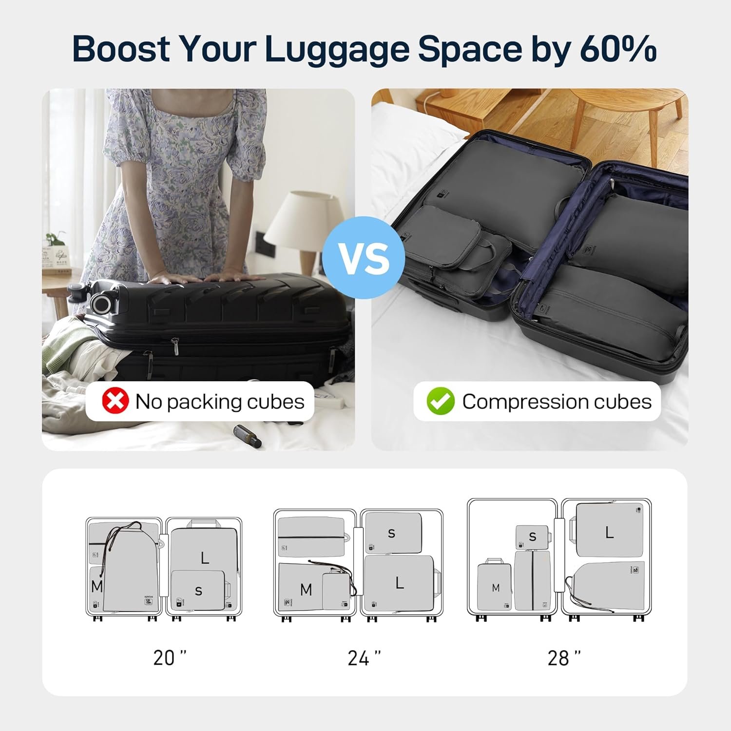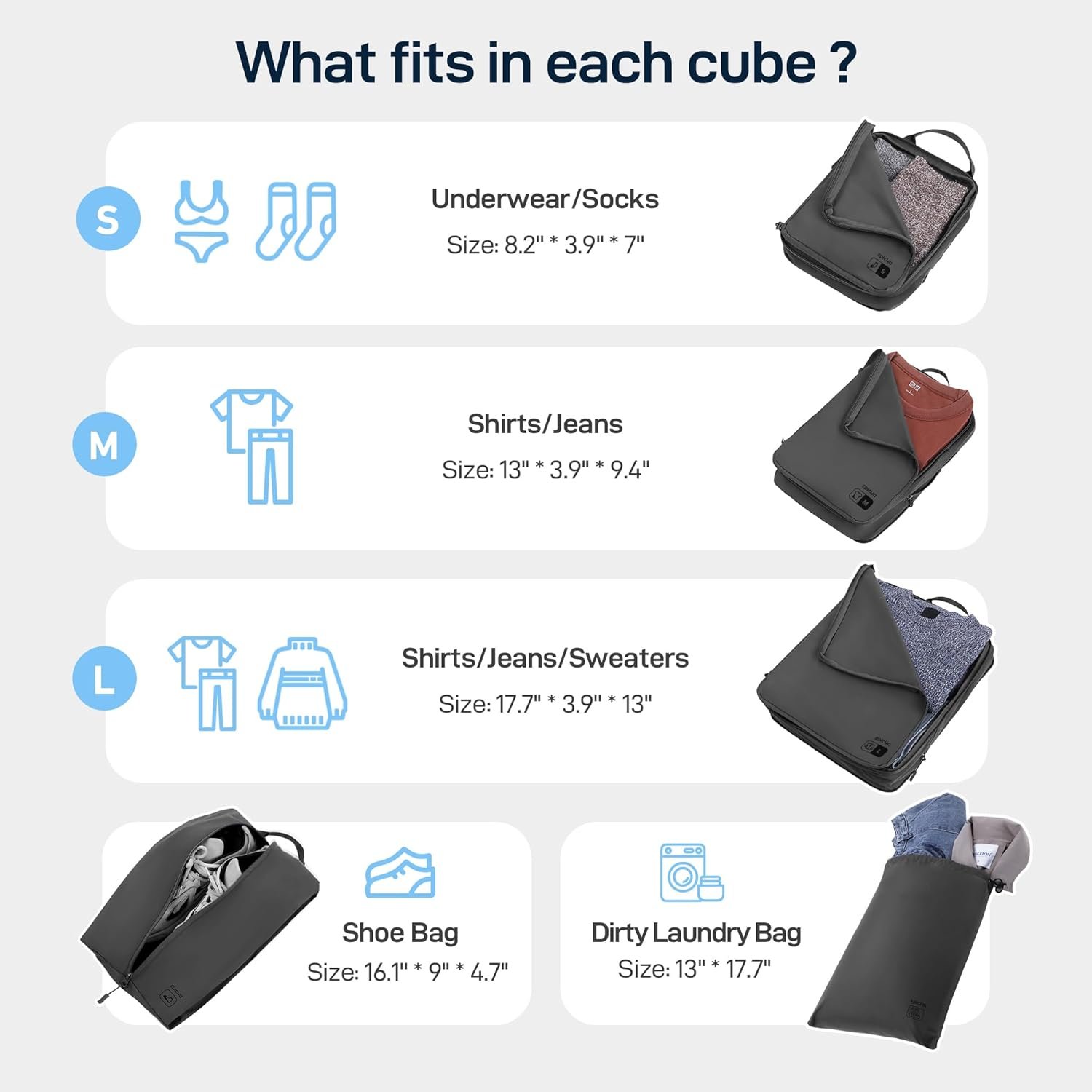 Versatile Sizes for Easy Travel: Includes sizes S (8.3″x3.9″x7.1″), M (13″x3.9″x9.4″), L (17.7″x3.9″x13″), Laundry Bag: (13″x17.7″), Shoe Bag: (16.1″x9″x4.7″).perfect for packing everything from small accessories to bulkier items.