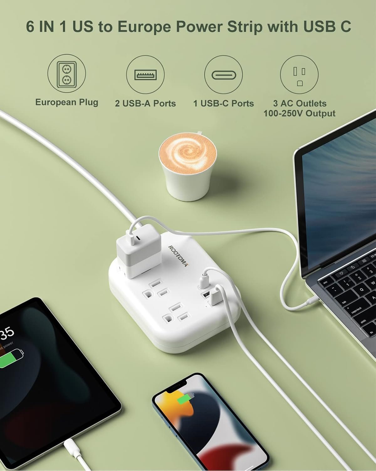 European Travel Plug Adapter with USB C, ROOTOMA Outlet Adapter US to Europe 3 Outlets 3 USB Ports, International Power Strip for EU Spain France Germany Iceland Greece, 3ft, White