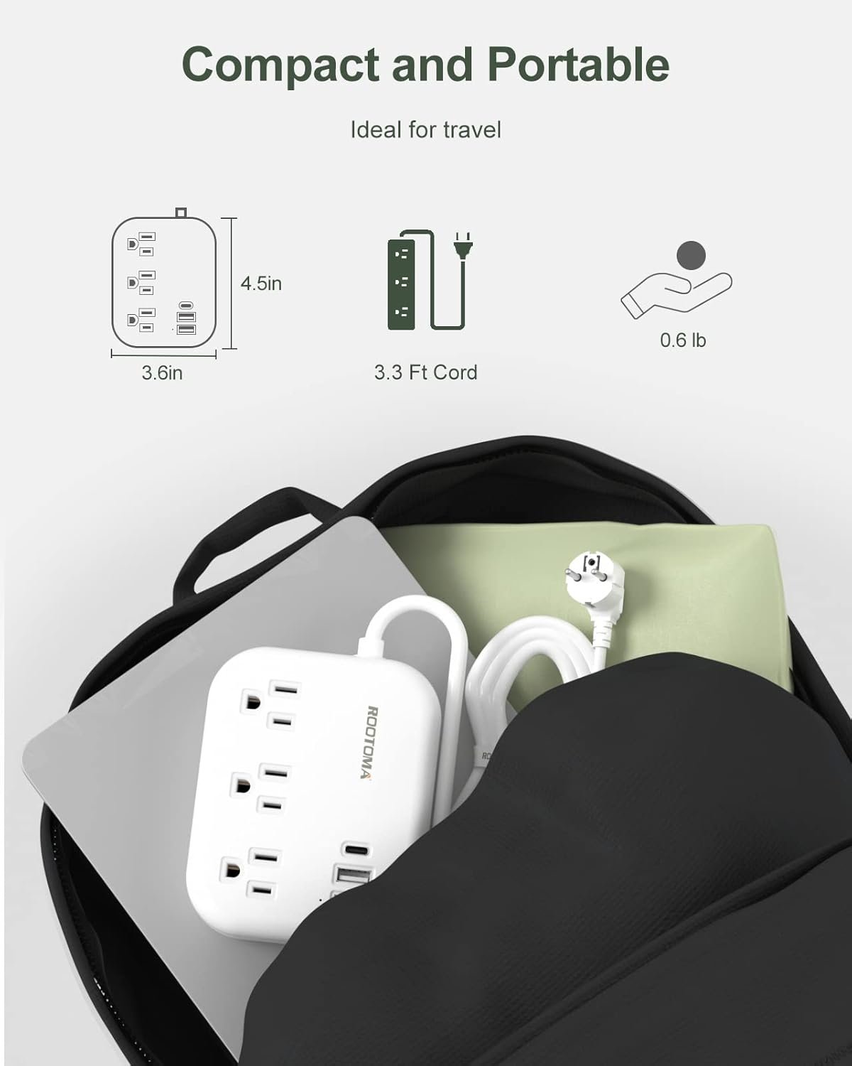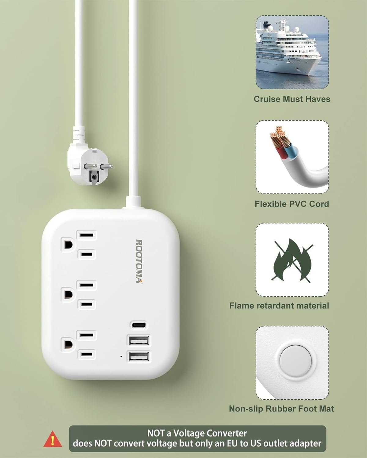【European Travel/Cruise Ship Must Haves】- This small power strip is designed with No surge protection, making it fully cruise ship approved.Small size of 4.5*3.6*1.2 IN can easy fit into luggage or briefcases,compact and lightweight, which helps to save your precious luggage space.This outlet extension cord is perfect for cruise ship,europe travel, etc(Tips: Does NOT work in ITALY, Israel, UK)