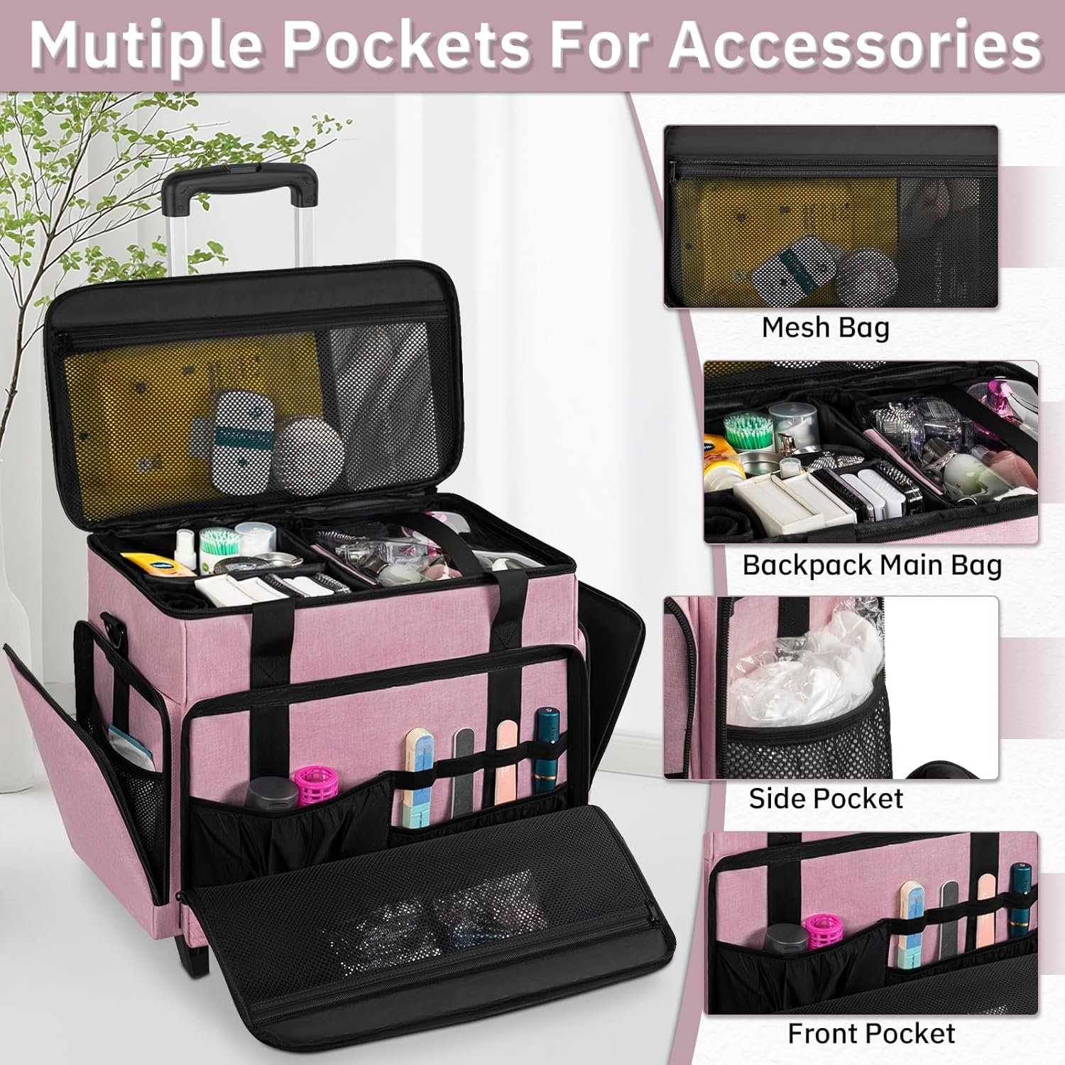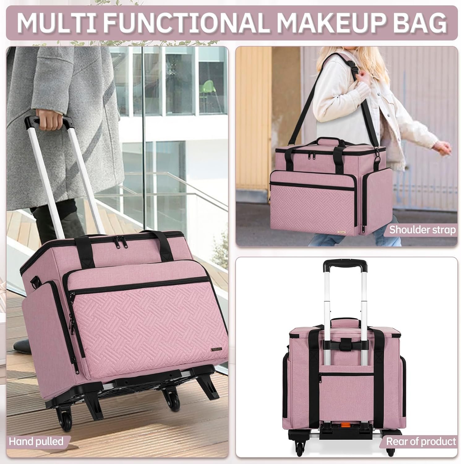 Extra Large Rolling Makeup Case with 4 Removable Pouches,Professional Make up Train Case with Wheels,Travel Cosmetic Bag for Hairstylists Nail Tech Makeup Artist with Detachable Trolley