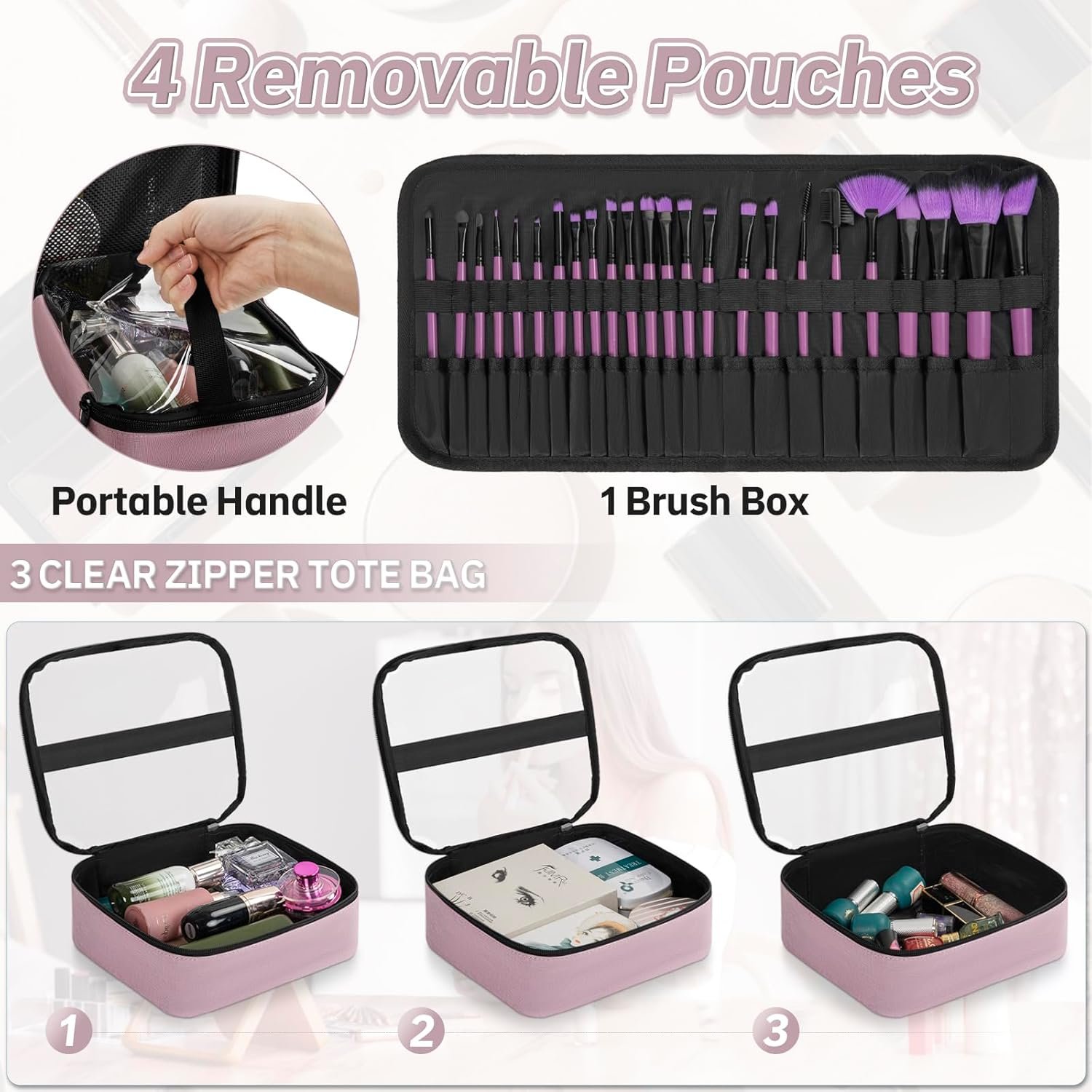 【4 Portable Small Makeup Bags】:This professional makeup bag comes with 3 independent transparent zipper boxes and 1 independent brush box, which can be used to classify and store your cosmetics, skin care products, nail polish, etc., while keeping them clean and easy to access