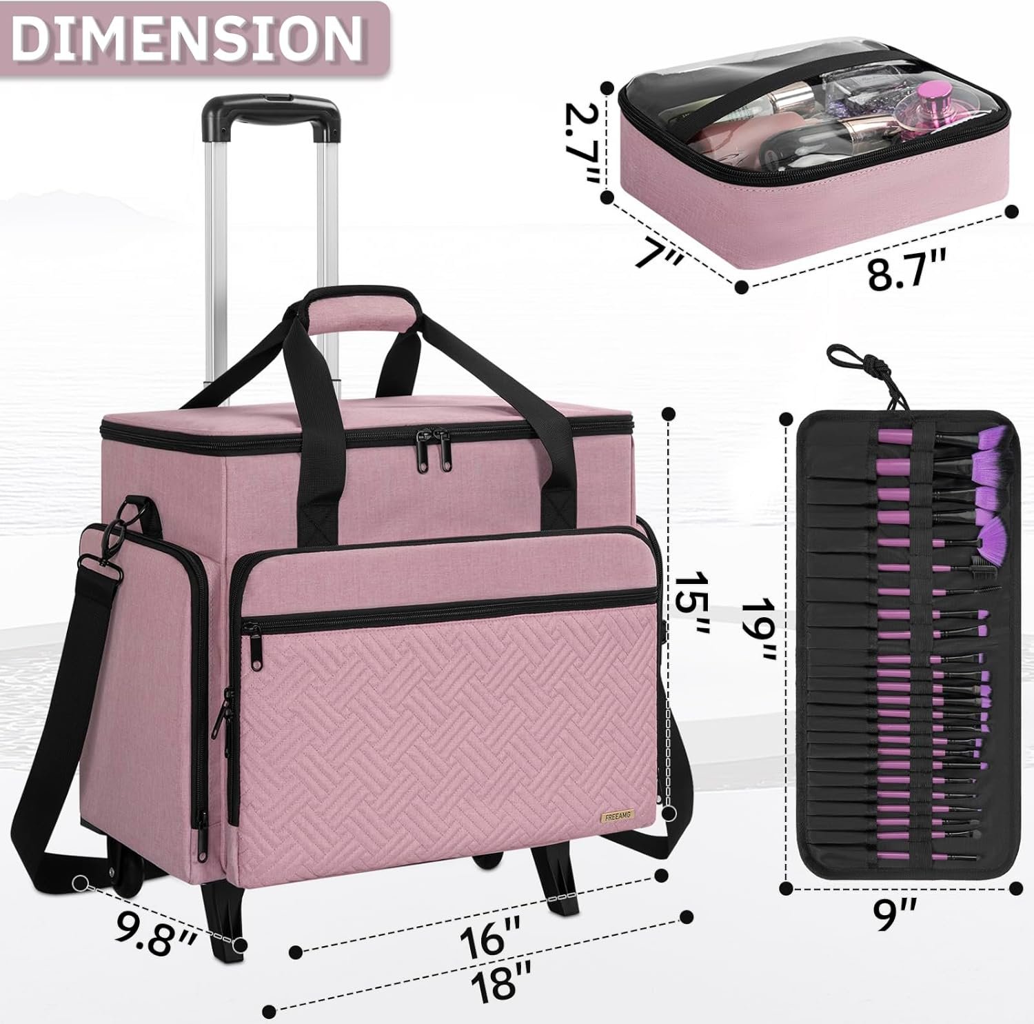 【Large Capacity & Multiple Pockets】:The size of this rolling makeup bag is 16.55″ x 9.85″ x 14.18″, which is large enough to hold all your makeup tools. It is also designed with dust-proof makeup brush slots, mesh pockets and additional pockets, providing ample internal storage space for cosmetics, jewelry, hair tools, etc
