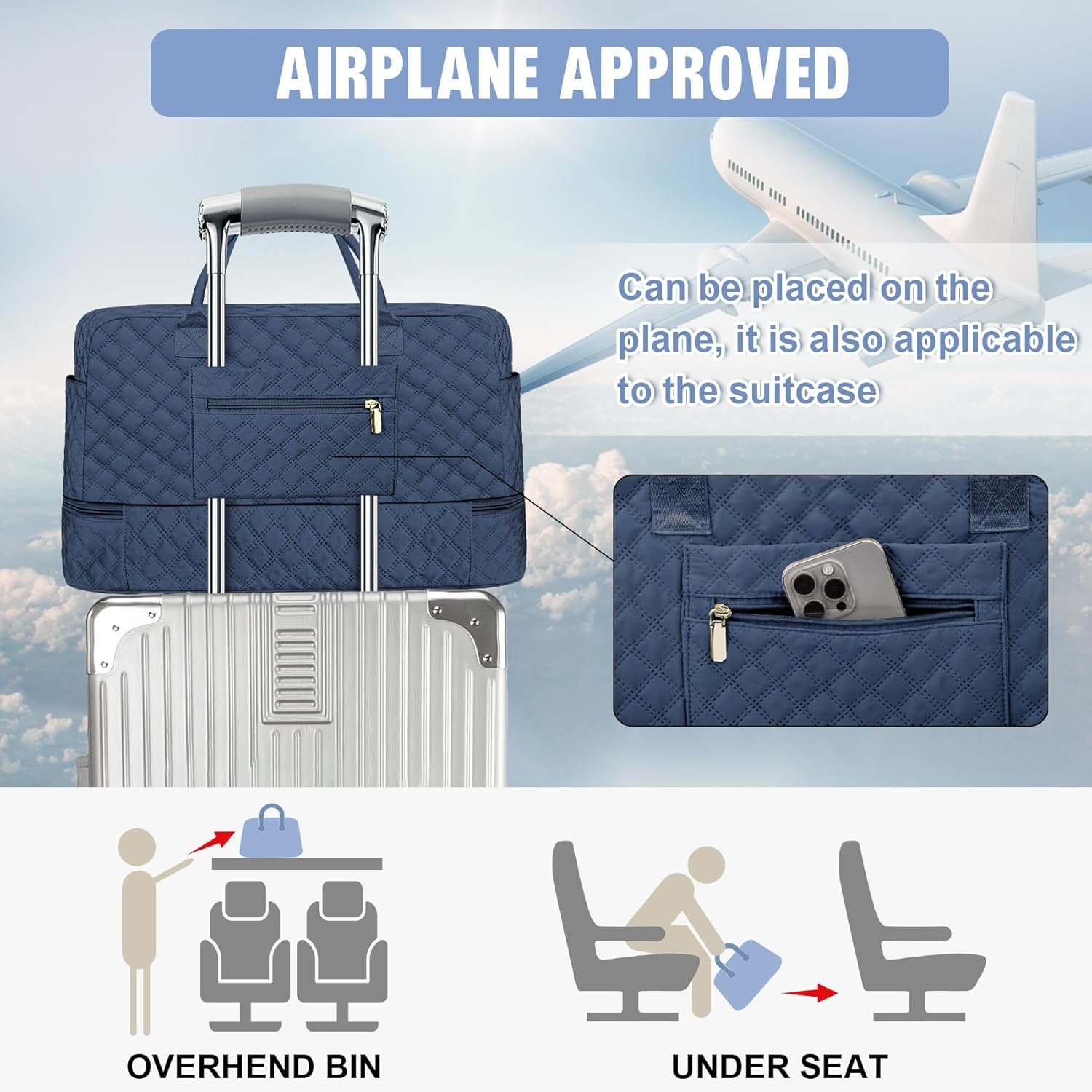 Airplane Friendly Duffle Bags: The carry on bags for airplanes women measures 21x9x14 inch, meeting most international carry-on bag requirements. Fits in the overhead compartments and under seats in aircraft; The luggage strap on the back of the weekender overnight bags for women can be hung on the suitcase to free your hands