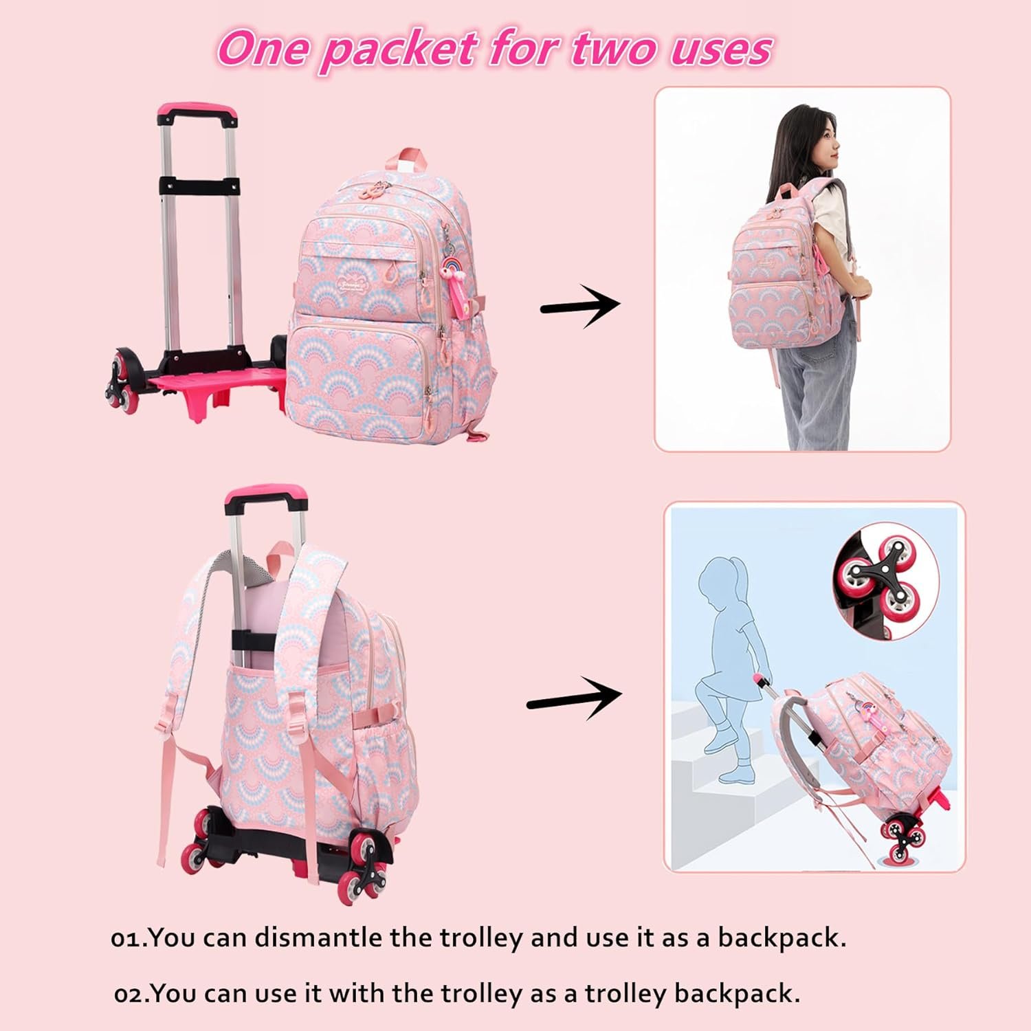 【Six-wheel design】Rolling backpack for kids are made of rubber,wear-resistant,noiseless, and the six wheels are designed not only for flat roads but also for stairs.This trolley backpack is designed with a telescopic handle,the height is freely adjustable,very easy to disassemble,there are a variety of ways to carry,to meet the different needs of children.
