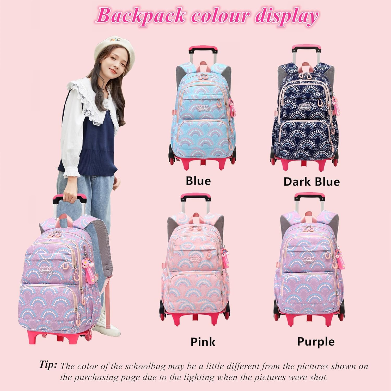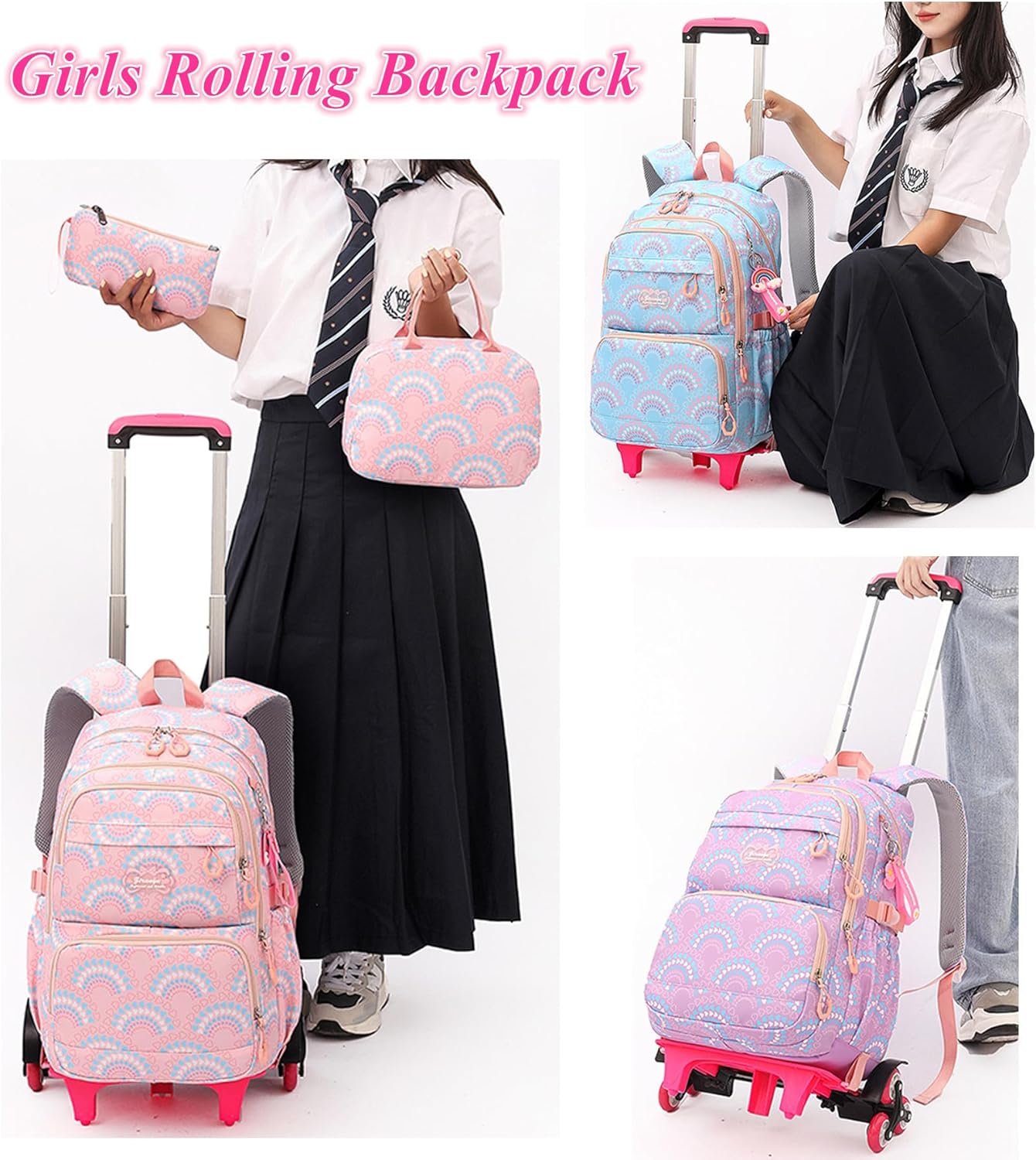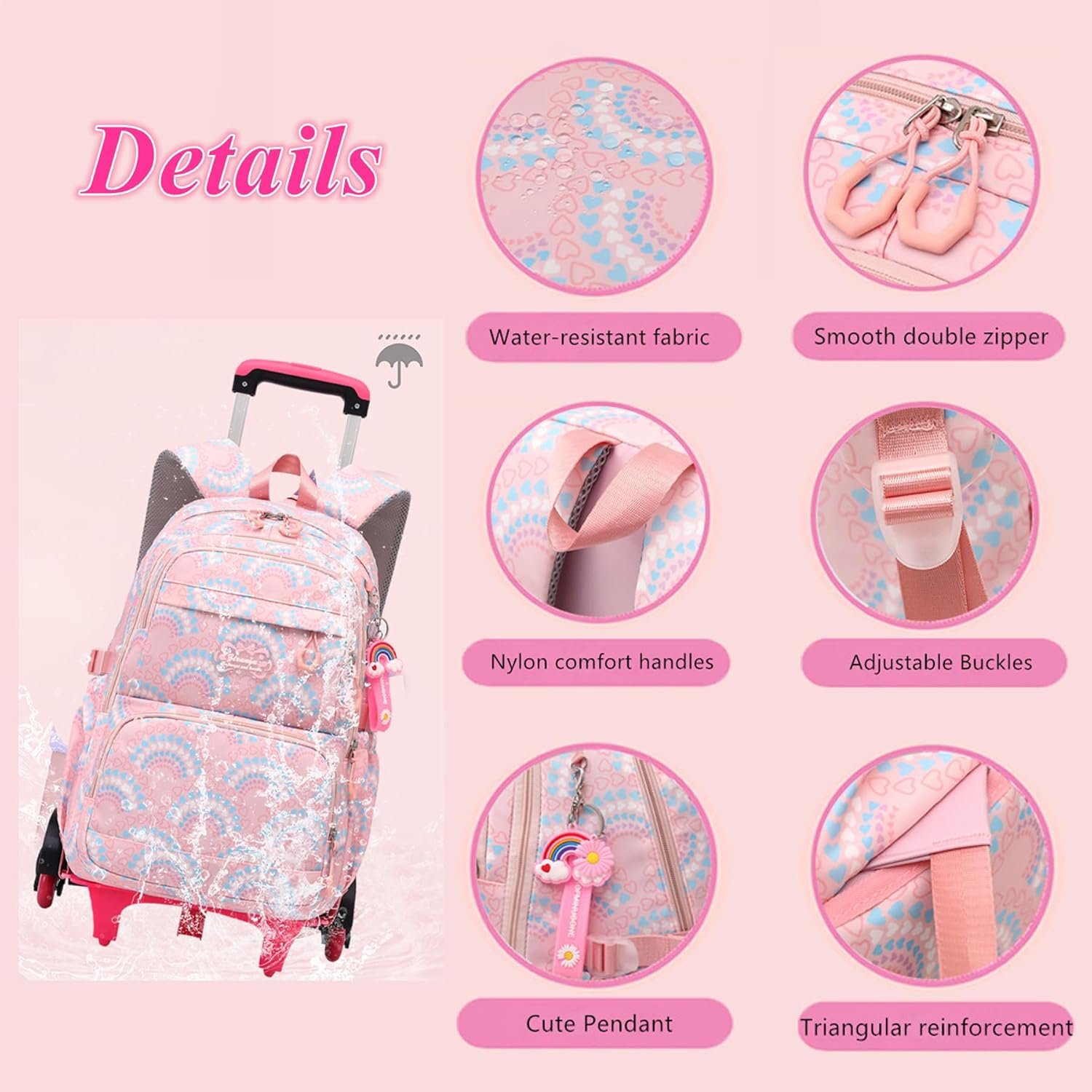【Backpack with Wheels for Girls Large Capacity】1 zippered main compartment, 3 front zippered pockets, 2 water bottle side pockets, 1 zippered inside pocket, and 1 laptop inside pocket. Separate computer compartment for laptop and Ipad, other pockets are suitable for books, documents, notebooks, water bottles and umbrellas.