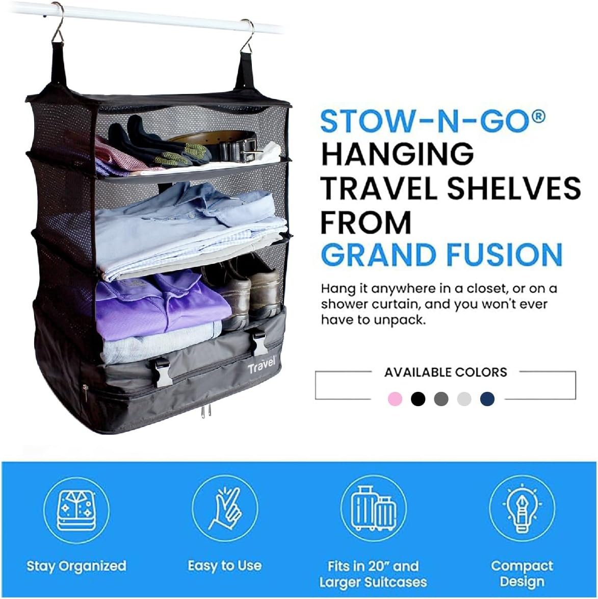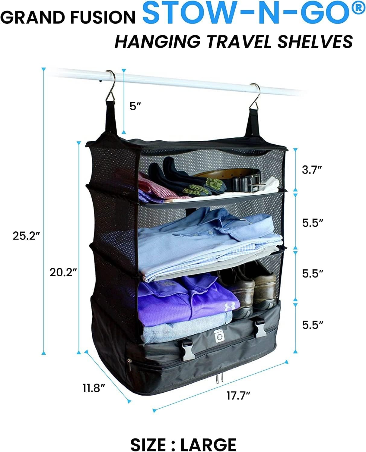 Grand Fusion Stow-N-Go Travel Luggage Organizer – Portable Hanging Travel Shelves, Carry-On Closet Organizer, Hanging Packing Cubes, Collapsible Carry-On Organizer for Cruises & Hotels. Black – XL