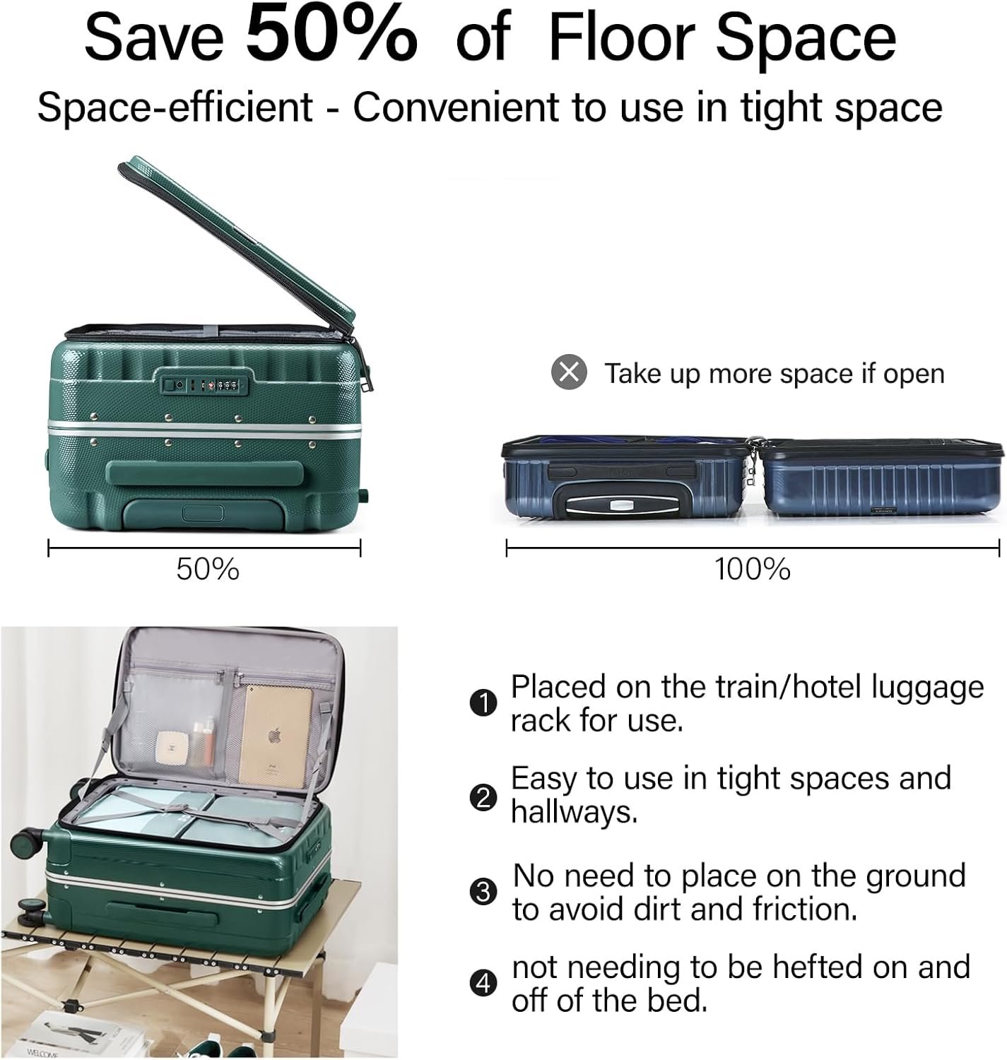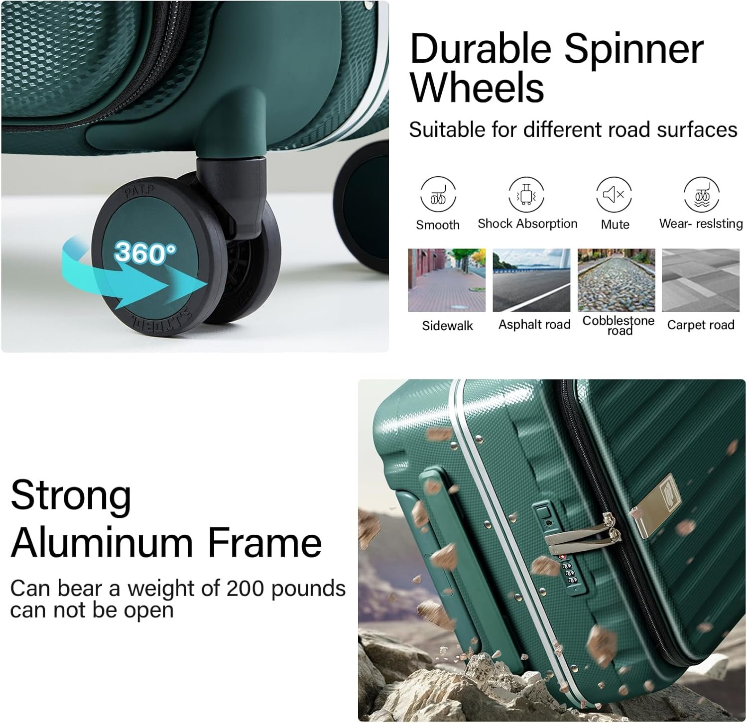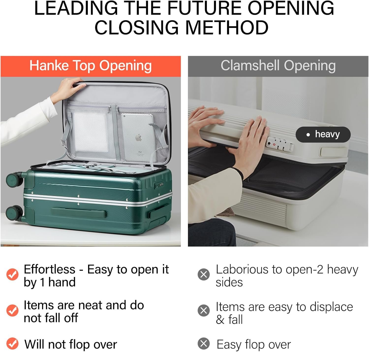 【CREATIVE FRONT OPENING】This trunk luggage with spinner wheels Leading the future opening and closing method which is effortless to open or close the suitcase, not only is it easy to load, but it also saves space. This design solves the problem that traditional luggage separated 2 compartments of heavy load then it’s difficult to open and close. Importantly, it also avoid the displacement of items.