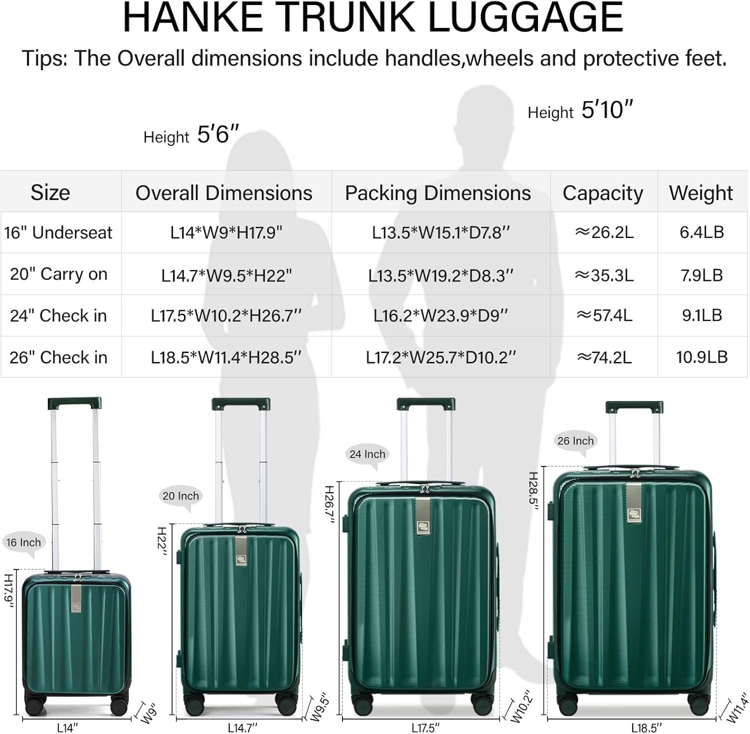 【DIMENSION】24 inch luggage overall dimensions is L17.5*W10.2*H26.7″(include handles,wheels and protective feet),packing dimensions is L16.2*W23.9*D9″,capacity≈57.4L,weight 9.1LB. Checked luggage airline approved.