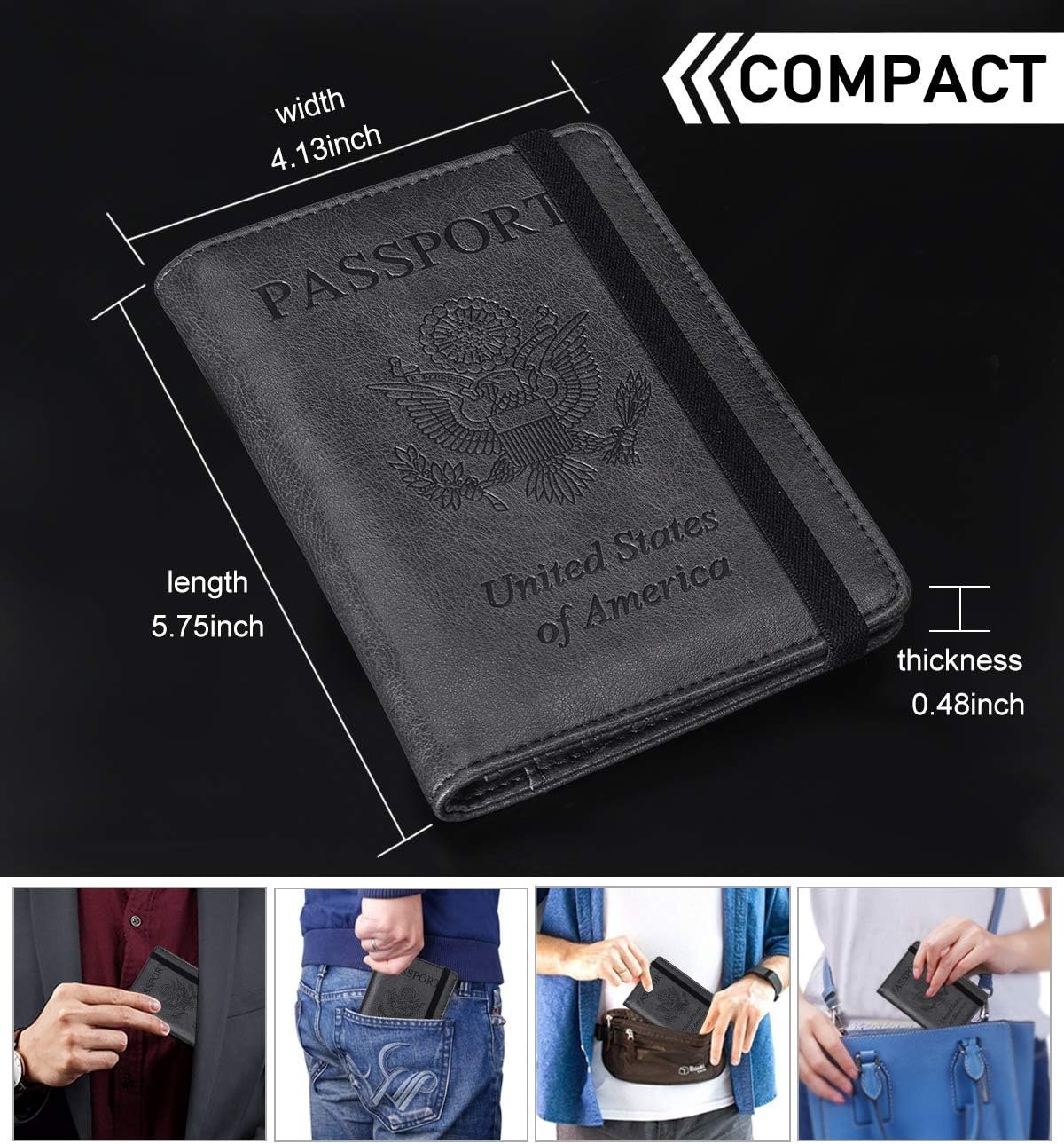 YOU NO LONGER WORRY ABOUT PERSONAL INFORMATION BEING STOLEN! In some countries, criminals will use NFC devices to steal personal information from your bank card. Our passport cover adopts double-layer RFID blocking protection, which can protect your bank card and ID card information from any NFC device. And the high quality elastic strap can prevent the items in the passport holder from falling down accidentally.