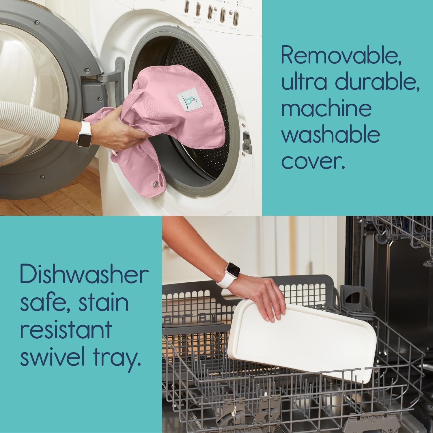 DISHWASHER-SAFE REMOVABLE SWIVEL TRAY | Like a personal dining room on the go, this portable baby chair booster seat comes equipped with a convenient attachable/detachable, dishwasher safe and BPA-free tray that swivels for hassle-free in and out. When your little one grows, remove the tray and boost him up to the kitchen table to eat with the grownups!